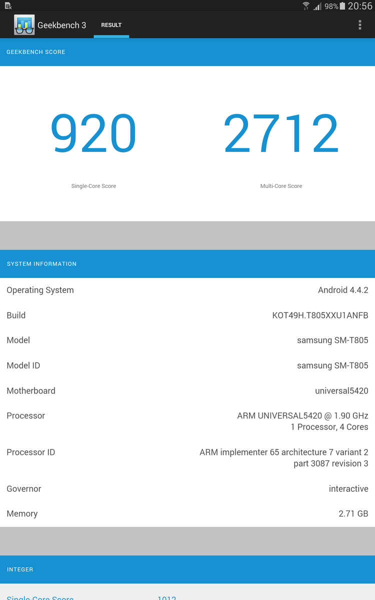 Samsung Galaxy Tab S 10.5 hiç şüphesiz tam bir teknoloji harikası. Ancak performansı biraz zayıf. Exynos işlemci mevcut Qualcomm roketleri ile aynı seviyede değil Ayrıca grafik performansı da Adreno 330'un biraz gerisinde. Ancak genel olarak Google Android 4.4 Kitkat ile iyi bir performans sunuyor. Ayrıca bellek arttırımı yapmak da mümkün.