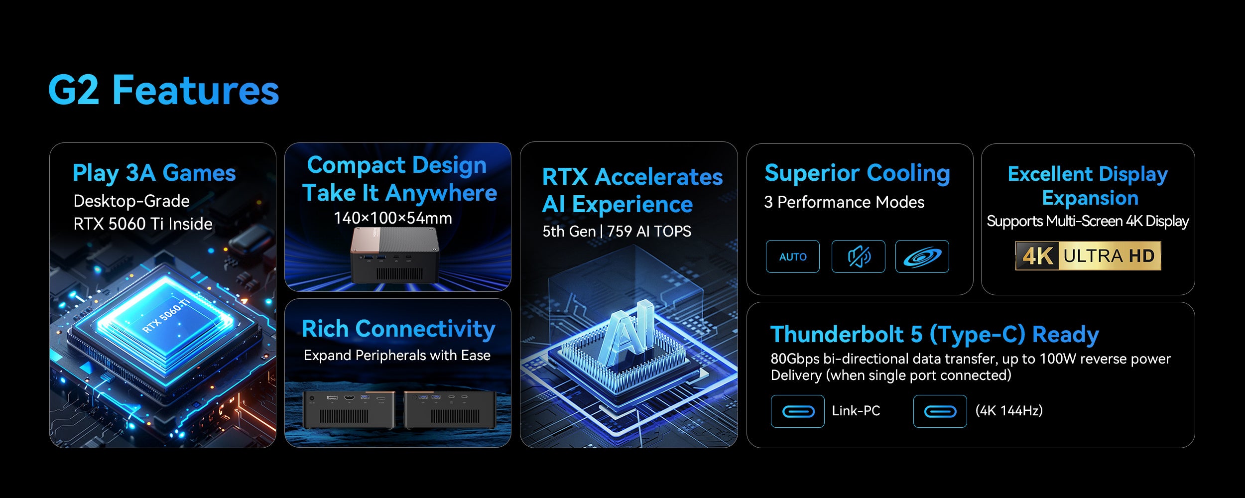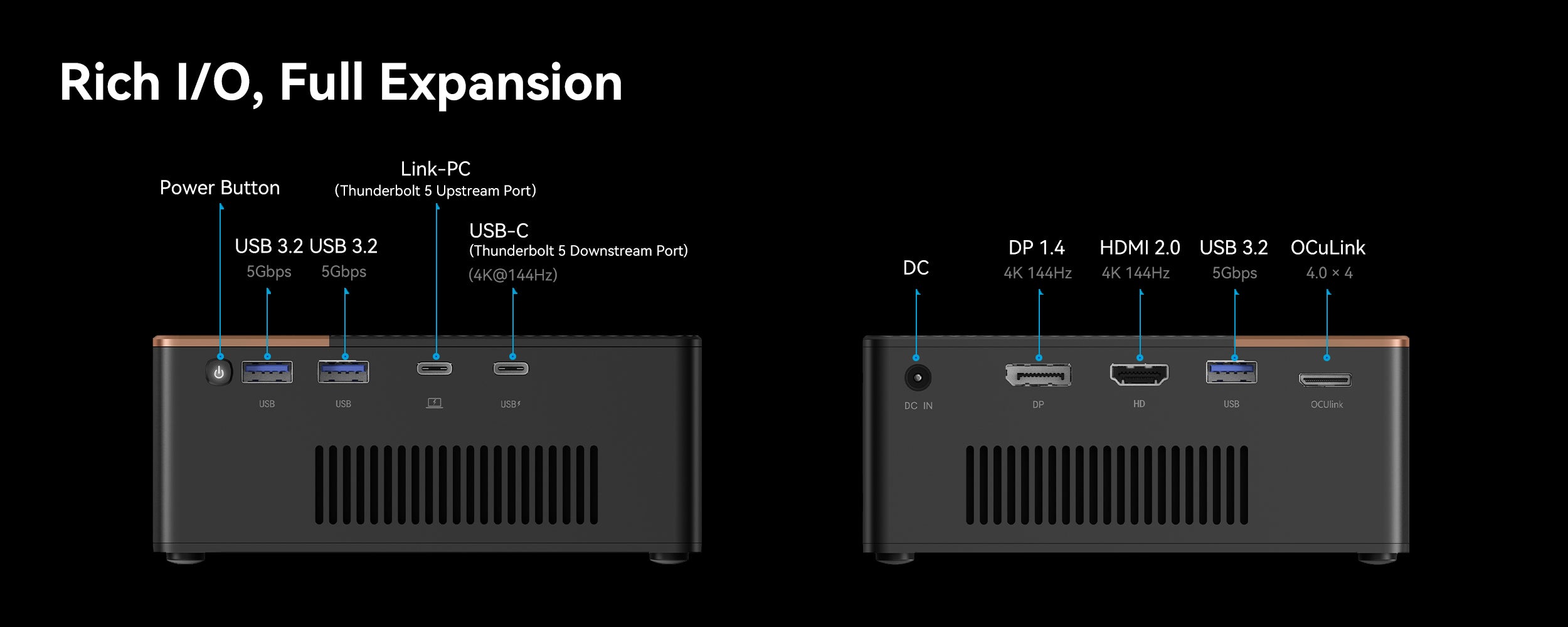 Belirli bir seviyede performans düşüşü olacaktır, ancak OCuLink ile, yetenekli bir ana bilgisayarla eşleştirildiğinde genellikle dörtte birini geçmez. Bu bağlantı noktası olmayan bir sisteme sahip olanlar için, Thunderbolt 5 bağlantı noktası vardır ve bu bağlantı noktası da USB4 v2 arayüzü.