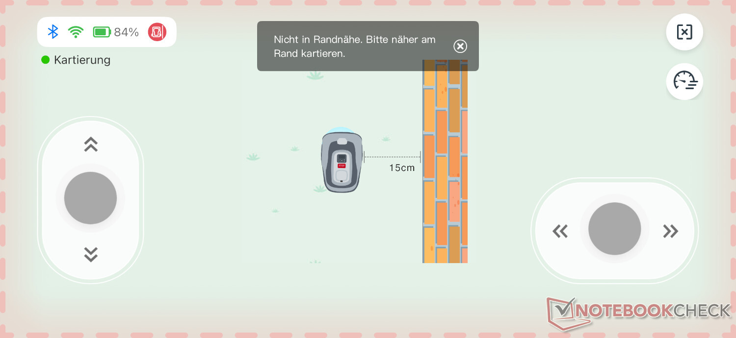 Alternatif olarak, manuel haritalama da mümkündür. Bu durumda robotik çim biçme makinesi, akıllı telefon ekranındaki iki sanal joystick kullanılarak bir tanıtım turu için yönlendirilir. Kontroller hoş olduğu ve çok hassas olmadığı için bu prensipte iyi çalışıyor. Bu, robotik çim biçme makinesinin çim sınırları boyunca hassas bir şekilde yönlendirilmesini sağlar.