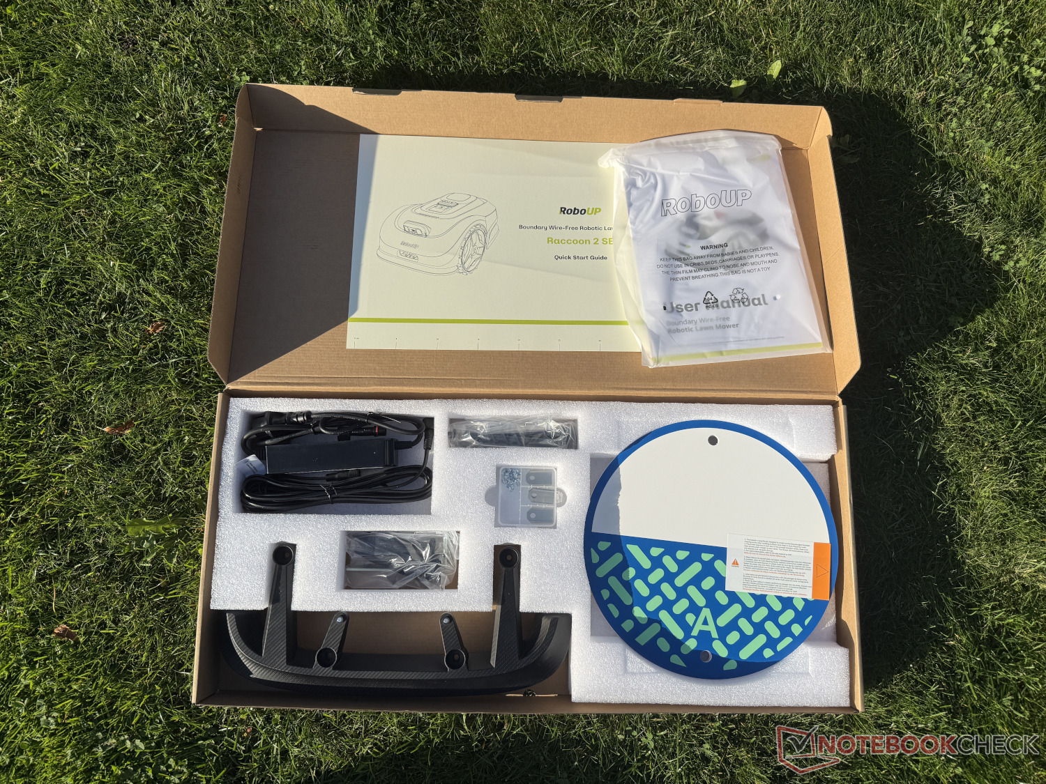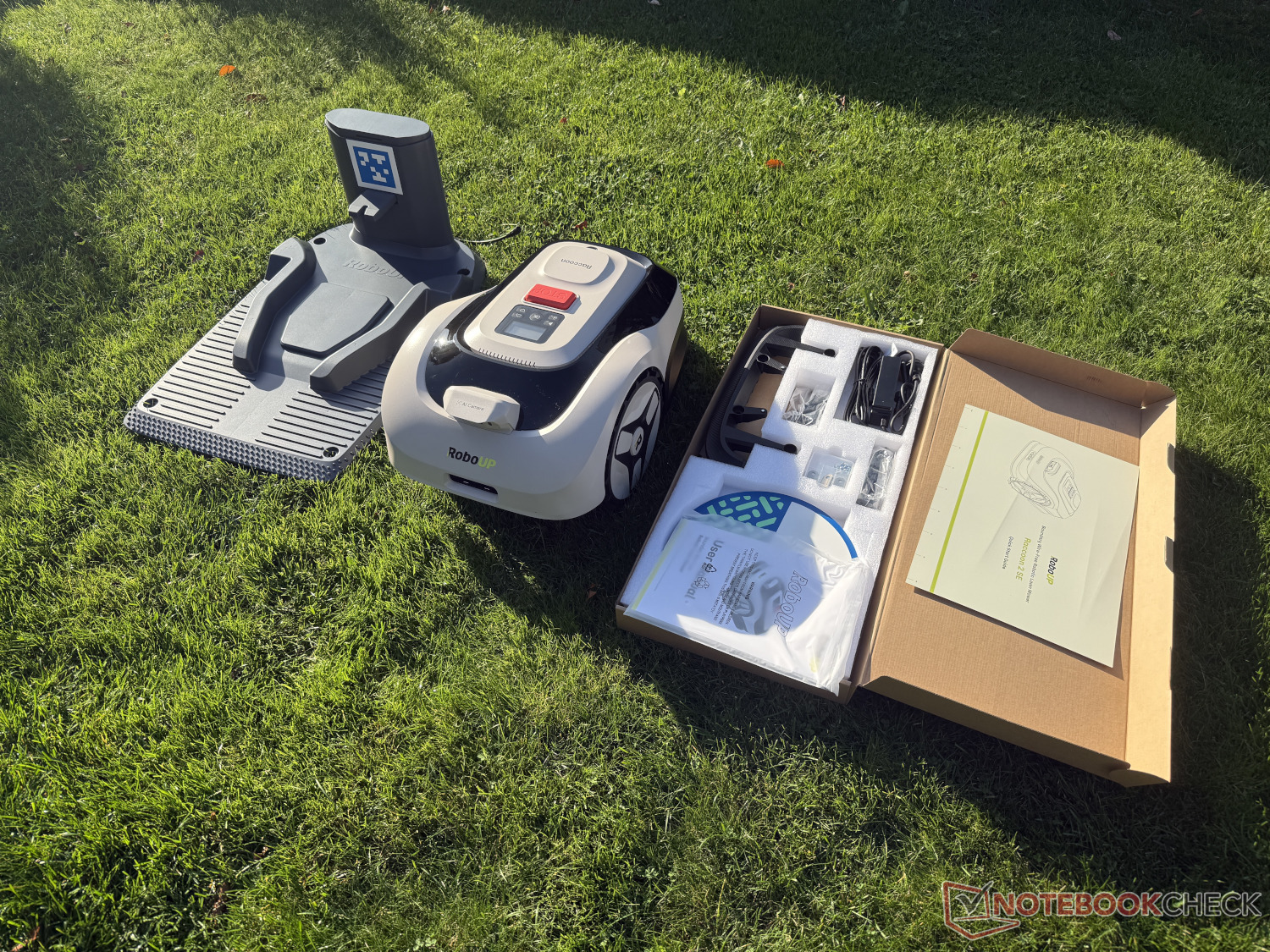Biçmeye başlamadan önce birkaç adım gereklidir. Şarj istasyonunun kurulmasına (güç bağlantısı ve zemin vidalarıyla sabitleme) ek olarak, ön tamponun cihazın alt tarafına tampon olarak vidalanması gerekir. Gerekli aletlerin yanı sıra iki işaret (daha fazlası aşağıda) ve üç set yedek bıçak dahildir. RoboUp Raccoon 2 SE artık kullanıma hazırdır.