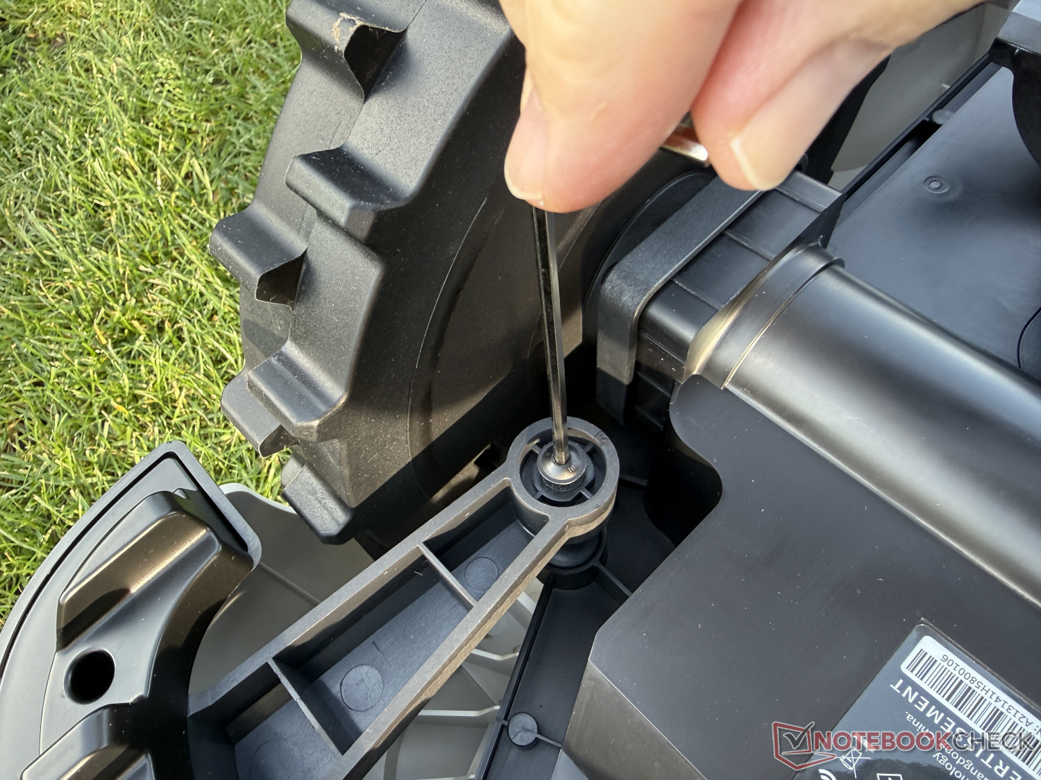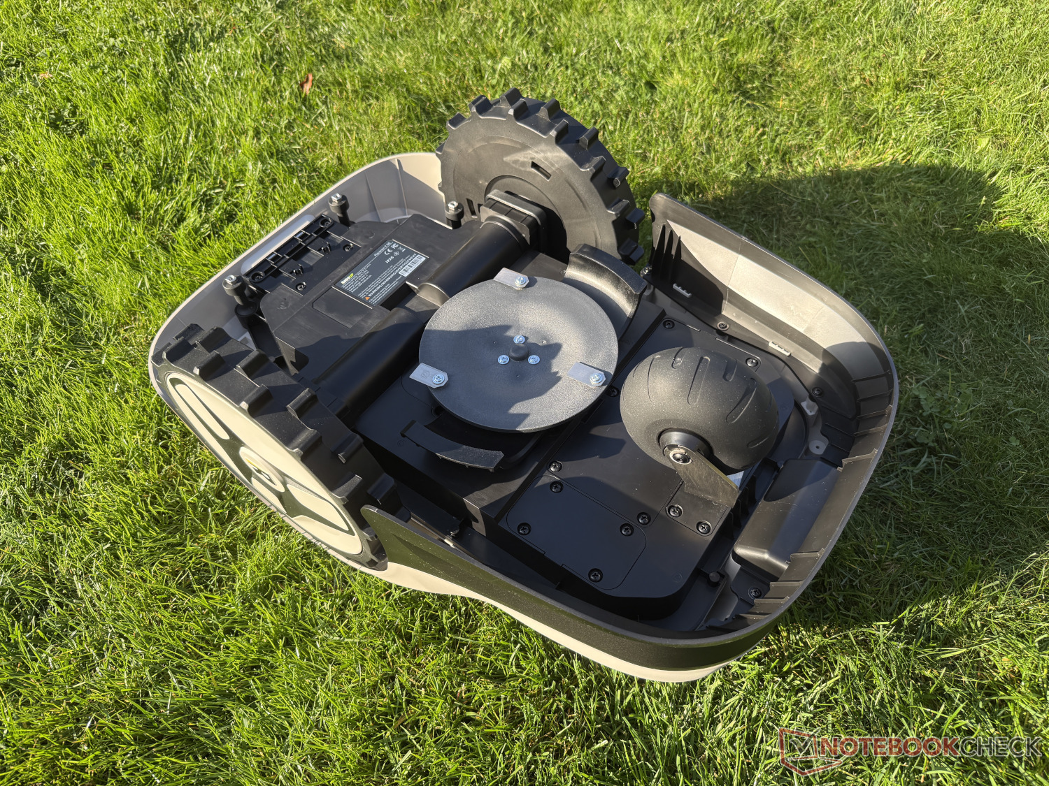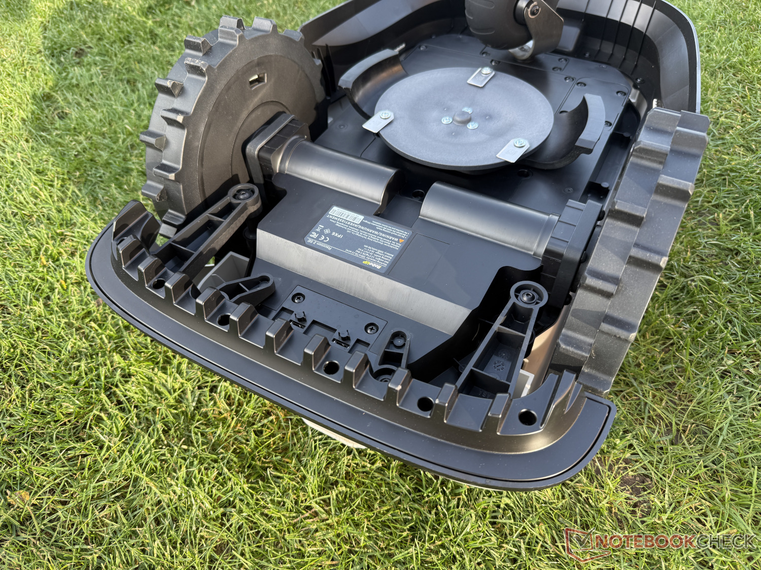 Alt tarafta, öndeki iki büyük tahrik tekerleğine ve arkadaki üçüncü bir tekerleğe ek olarak, biçme tablası bulunmaktadır. Dönen biçme diski üç serbest salınımlı bıçakla donatılmıştır ve 20 cm kesme genişliğine sahiptir. Bu büyük değildir, ancak küçük bahçeler için tasarlanmış bir model için yeterlidir.