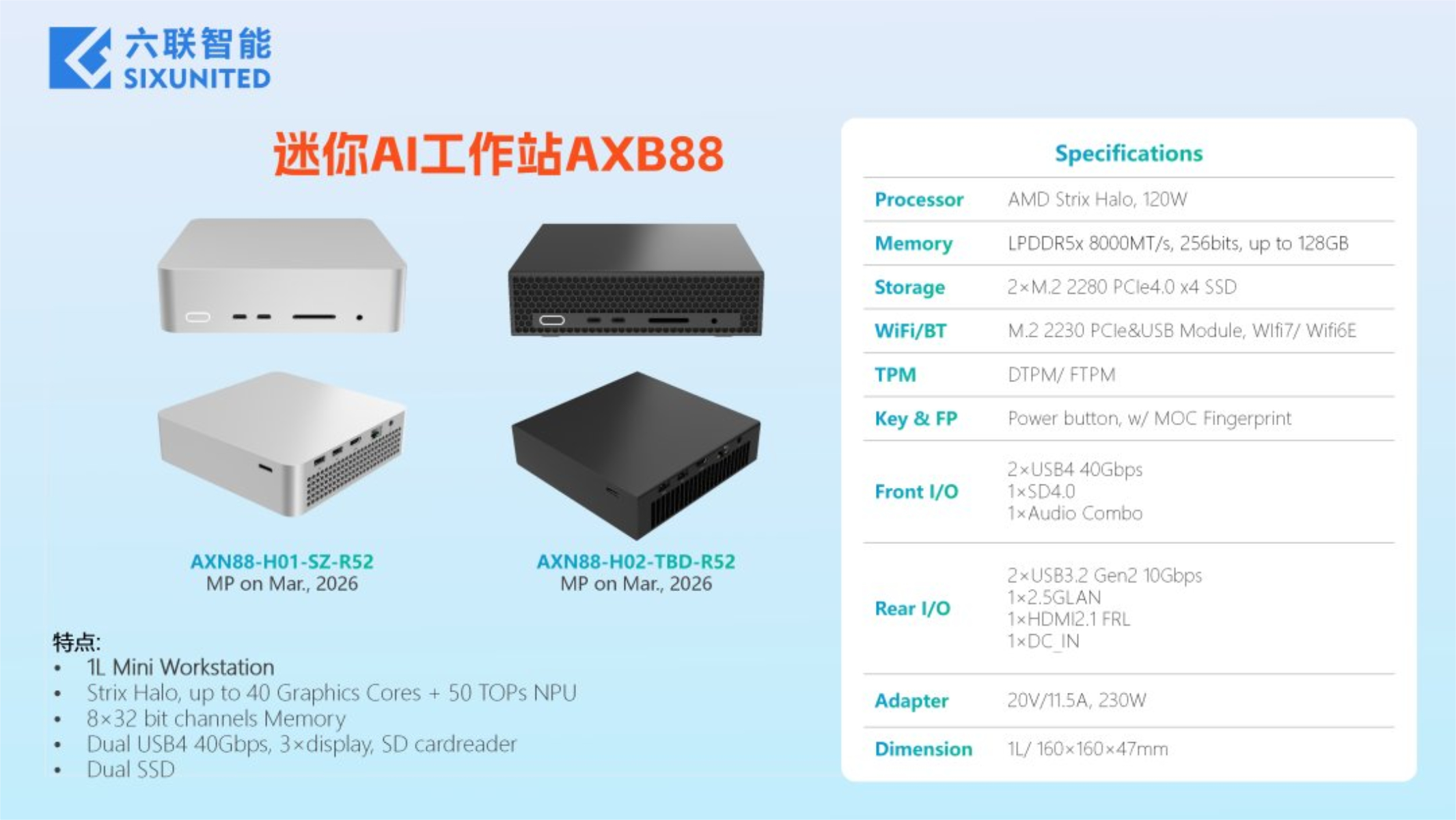 Şirket aynı zamanda aynı mimariyle desteklenen iki mini PC'yi de tanıttı. Bunlar 2-litre özellikli iken ve 4 litrelik kasalarsixunited, Mini AI Workstation AXB88 ile daha da küçüldüğünü iddia ediyor. Aşağıdaki grafikte gösterildiği gibi, AXB88 gösterilen iki kaplamadan bağımsız olarak 160 x 160 x 47 mm boyutlarındadır ve bu da rakip Strix Halo mini PC'lerden çok daha küçüktür GMKtec EVO-X2 (Amazon'da şu anda 1.699 dolar).
