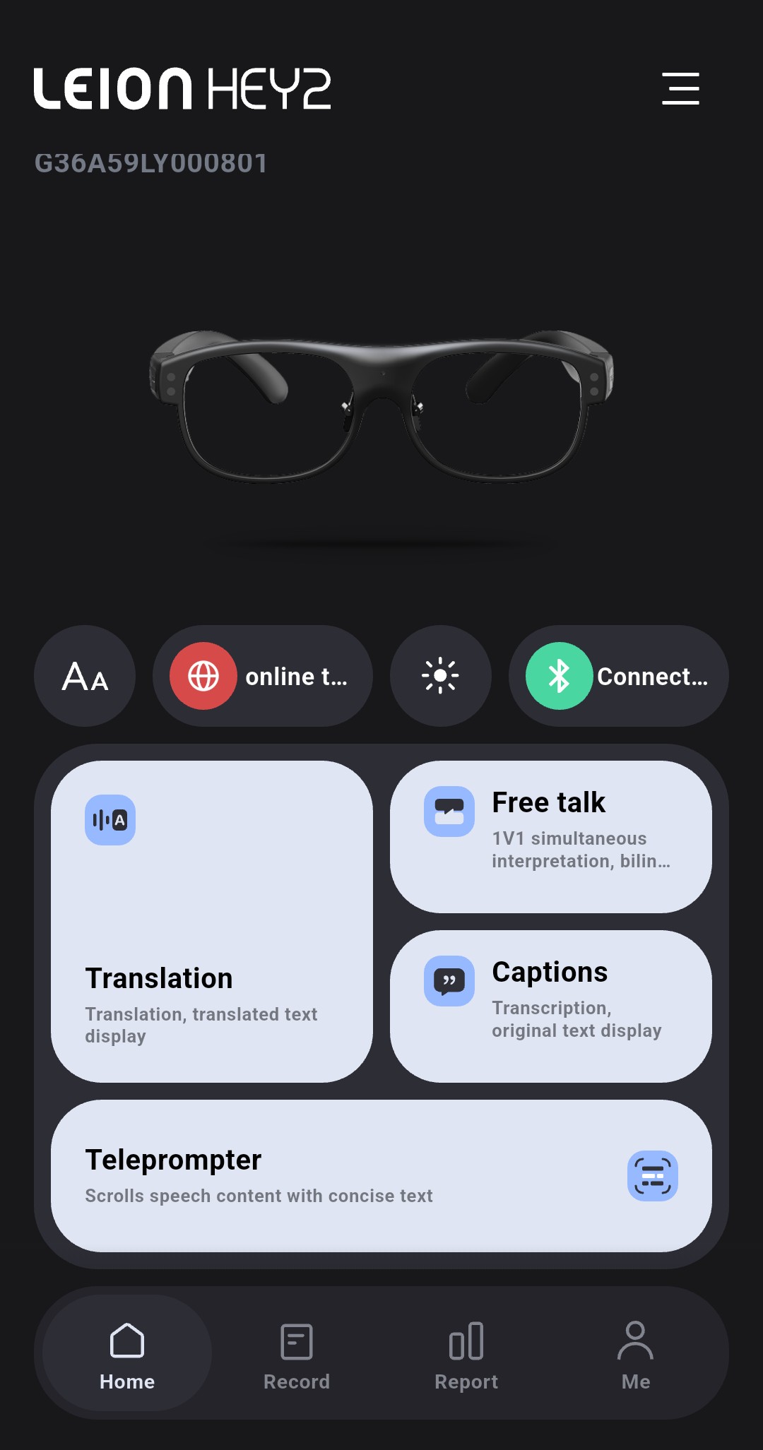 Leion Hey 2 gözlükleri, konuşmaları gerçek zamanlı olarak doğrudan camlara aktarmak ve tercüme etmek üzere tasarlanmıştır.