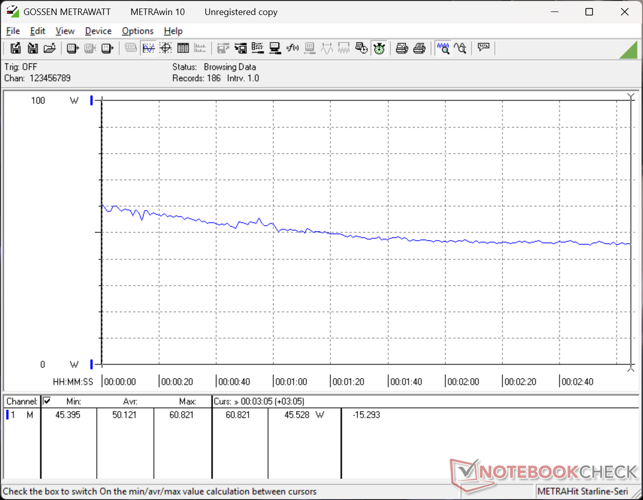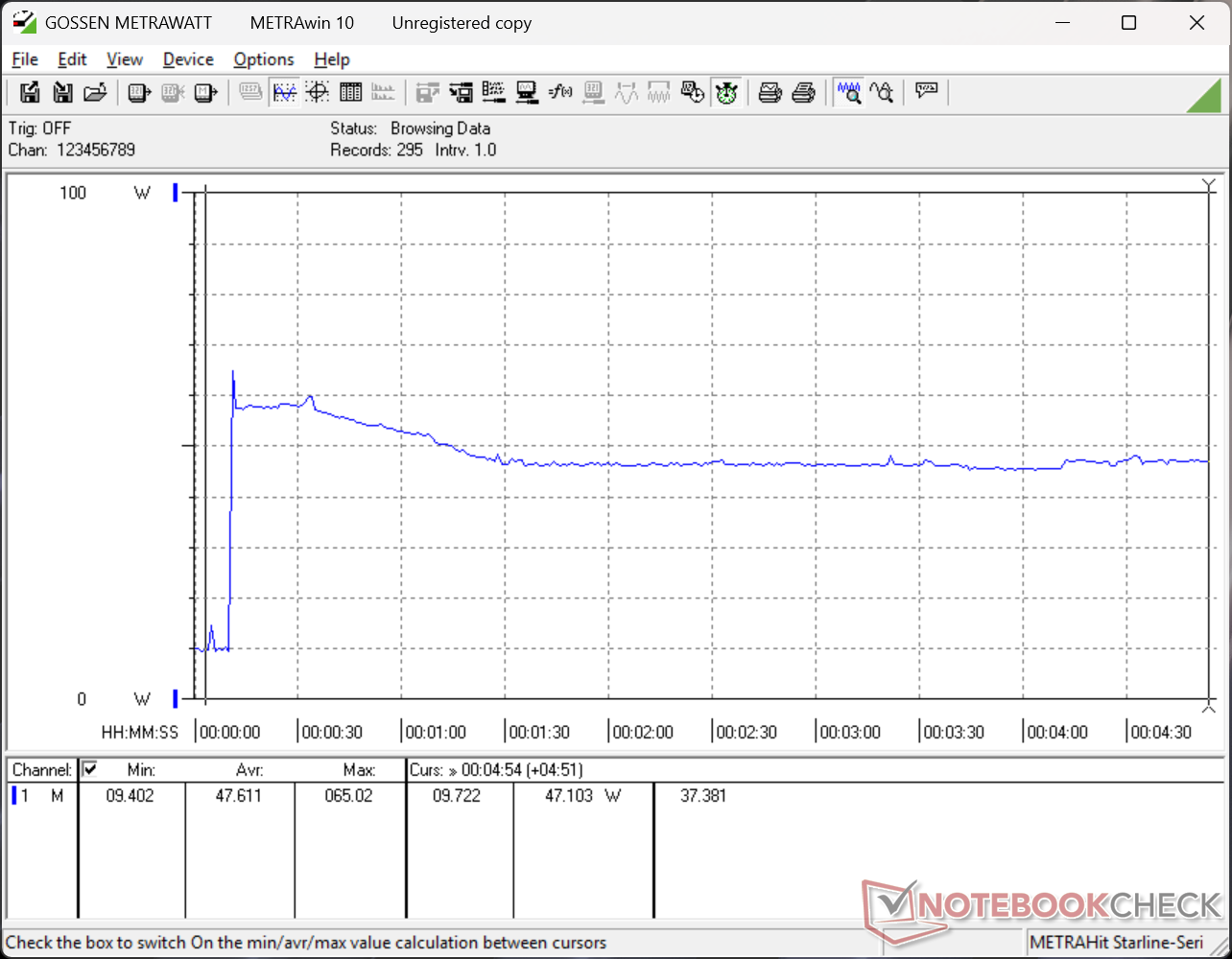 Sistem, CPU tamamen zorlandığında küçük (9 x 4,6 x 2,7 cm) USB-C AC adaptörünün 65 W çıkışının tamamını çekebilir, ancak aşağıdaki grafikte gösterildiği gibi bu sadece geçicidir.