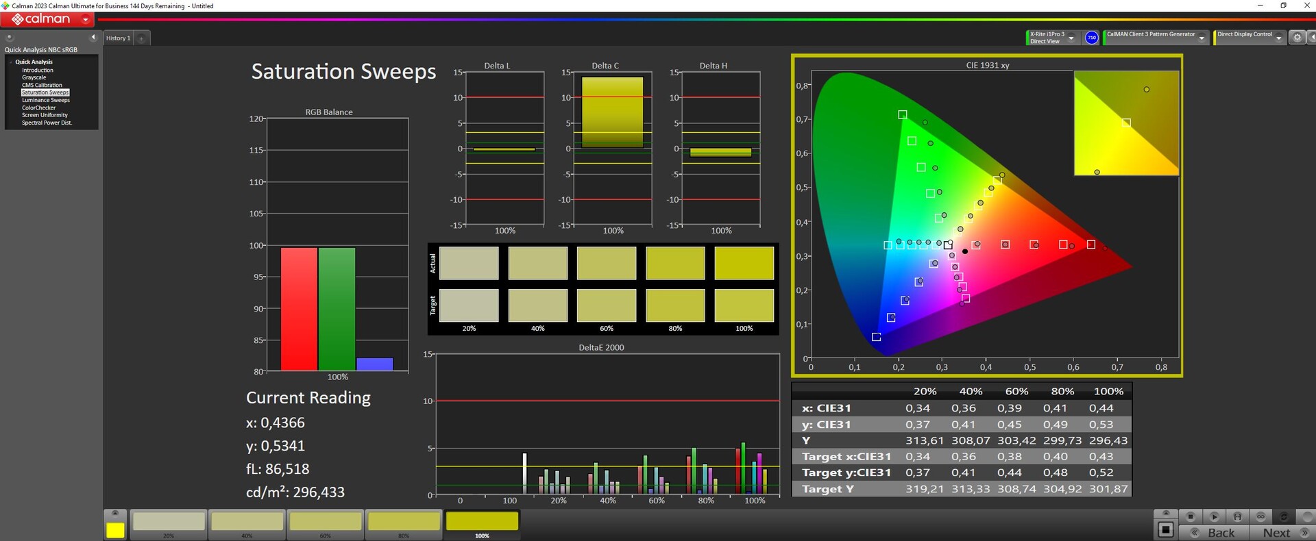 Ex çalışır, ekran P3 standardına göre uygun şekilde kalibre edilmiştir. Yeniden kalibrasyonumuz gri tonlamalı DeltaE değerlerini iyileştirdi ancak ClocChecker DeltaE değerlerini kötüleştirdi, bu yüzden çabaya değmez. Bununla birlikte, renk sapmaları 2,68 ortalama ve 6,41'e varan aykırı değerlerle ideal değildir.