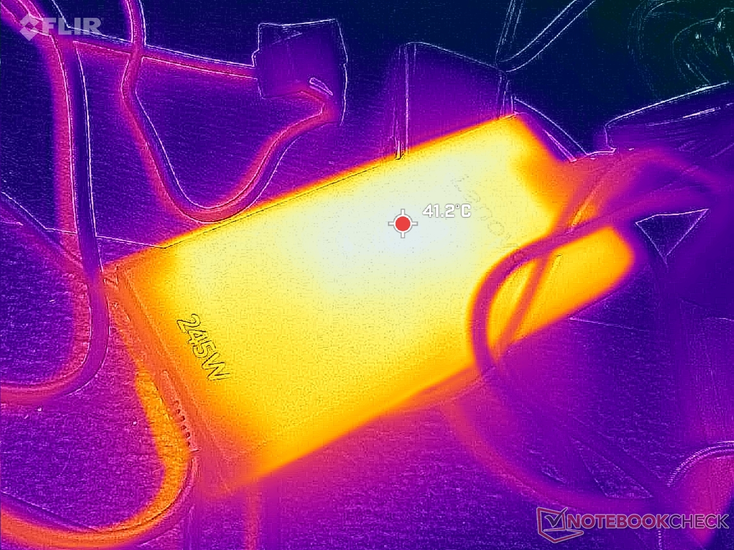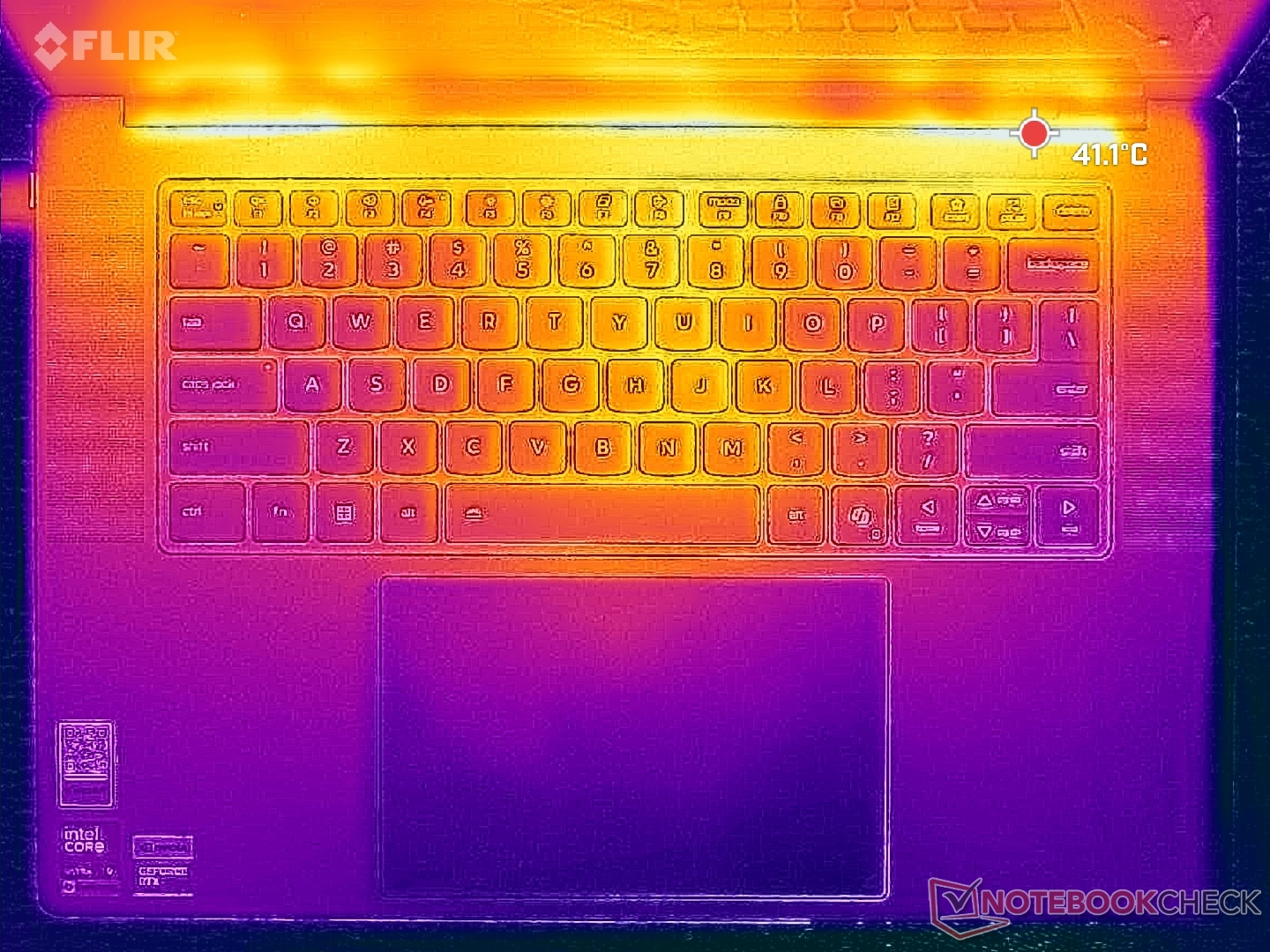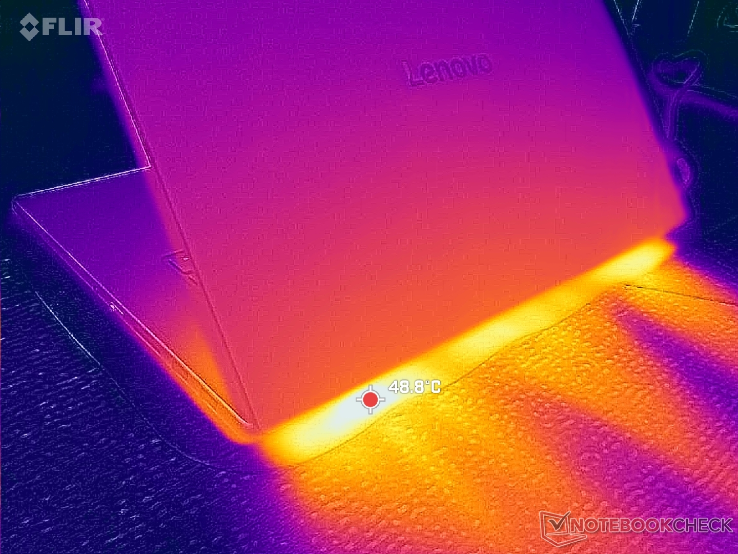 Yüzey sıcaklıkları, eski modele göre daha küçük boyutlara rağmen belirgin şekilde daha soğuk. Örneğin Cyberpunk 2077'yi çalıştırırken, aynı Nvidia GPU'ya sahip Yoga Pro 9i 16IAH G10 Aura'daki 42 C ve 49 C'ye kıyasla ünitemizdeki sıcak noktalar yalnızca 38 C ve 41 C'de zirveye ulaştı.