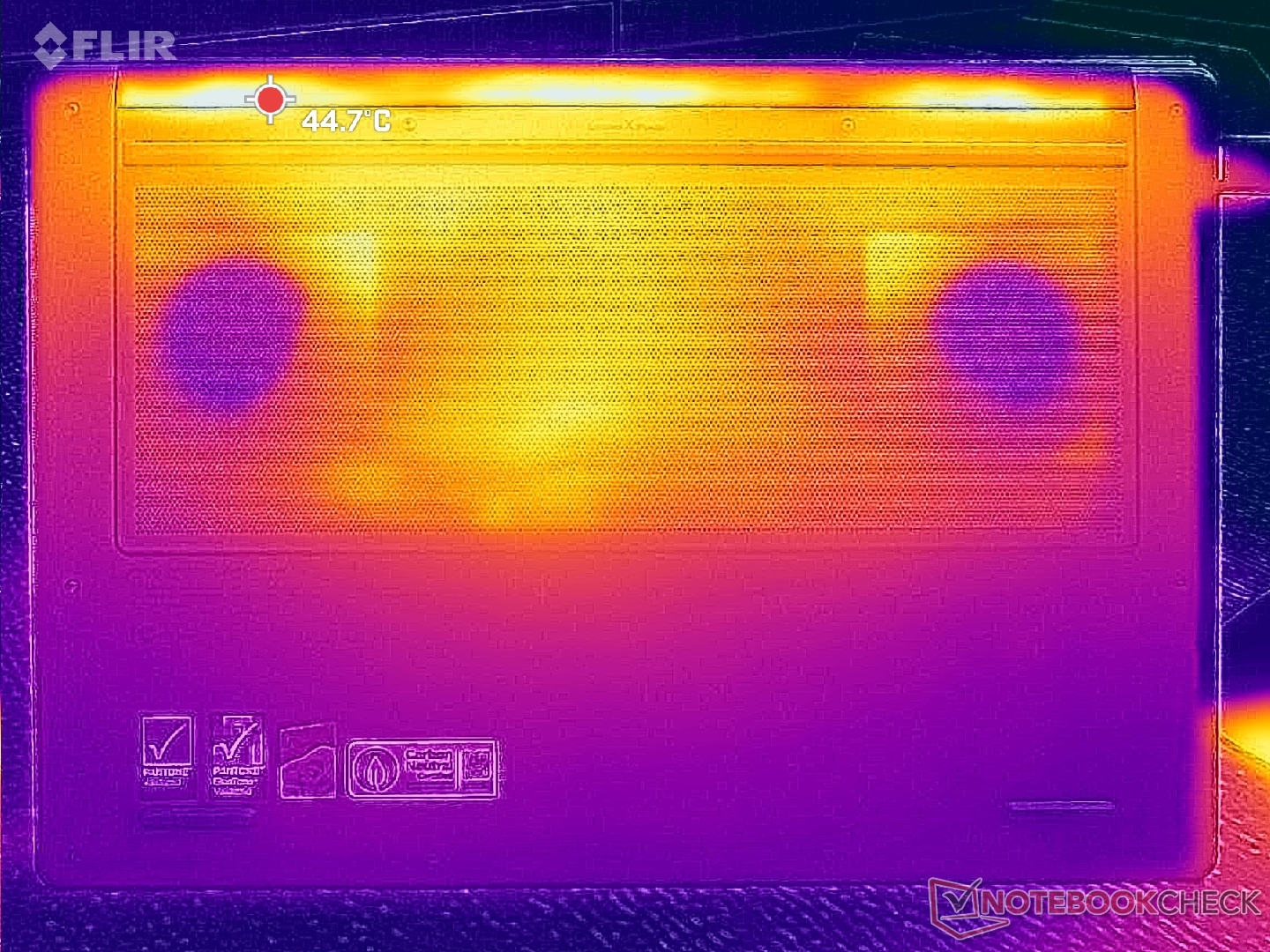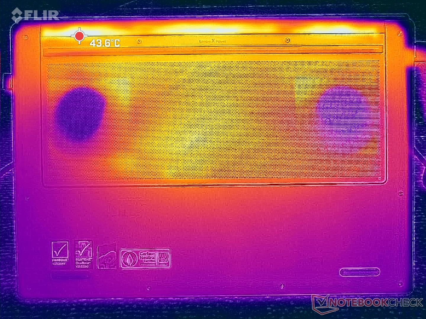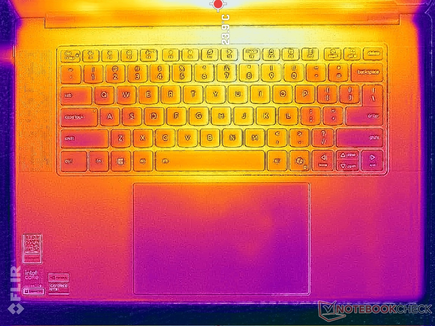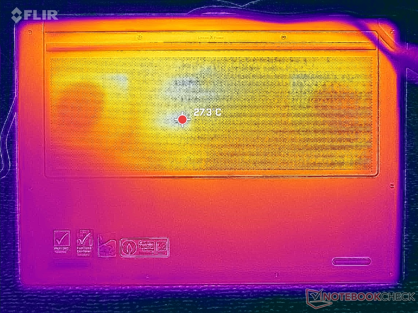 Yüzey sıcaklıkları, eski modele göre daha küçük boyutlara rağmen belirgin şekilde daha soğuk. Örneğin Cyberpunk 2077'yi çalıştırırken, aynı Nvidia GPU'ya sahip Yoga Pro 9i 16IAH G10 Aura'daki 42 C ve 49 C'ye kıyasla ünitemizdeki sıcak noktalar yalnızca 38 C ve 41 C'de zirveye ulaştı.