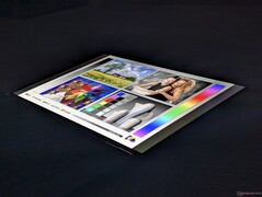 Ünitemizdeki tandem OLED ekran, Samsung ATNA60KA04-0 panelinin aynısıdır 2025 Yoga Pro 9i 16 aynı görüntüleme deneyimi için. Kendi ölçümlerimiz, SDR modunda 931 nit ve HDR modunda 1480 nit maksimum merkez parlaklığını ortaya çıkararak bunu 16 inç dizüstü bilgisayarlardaki en parlak ekranlardan biri haline getiriyor.