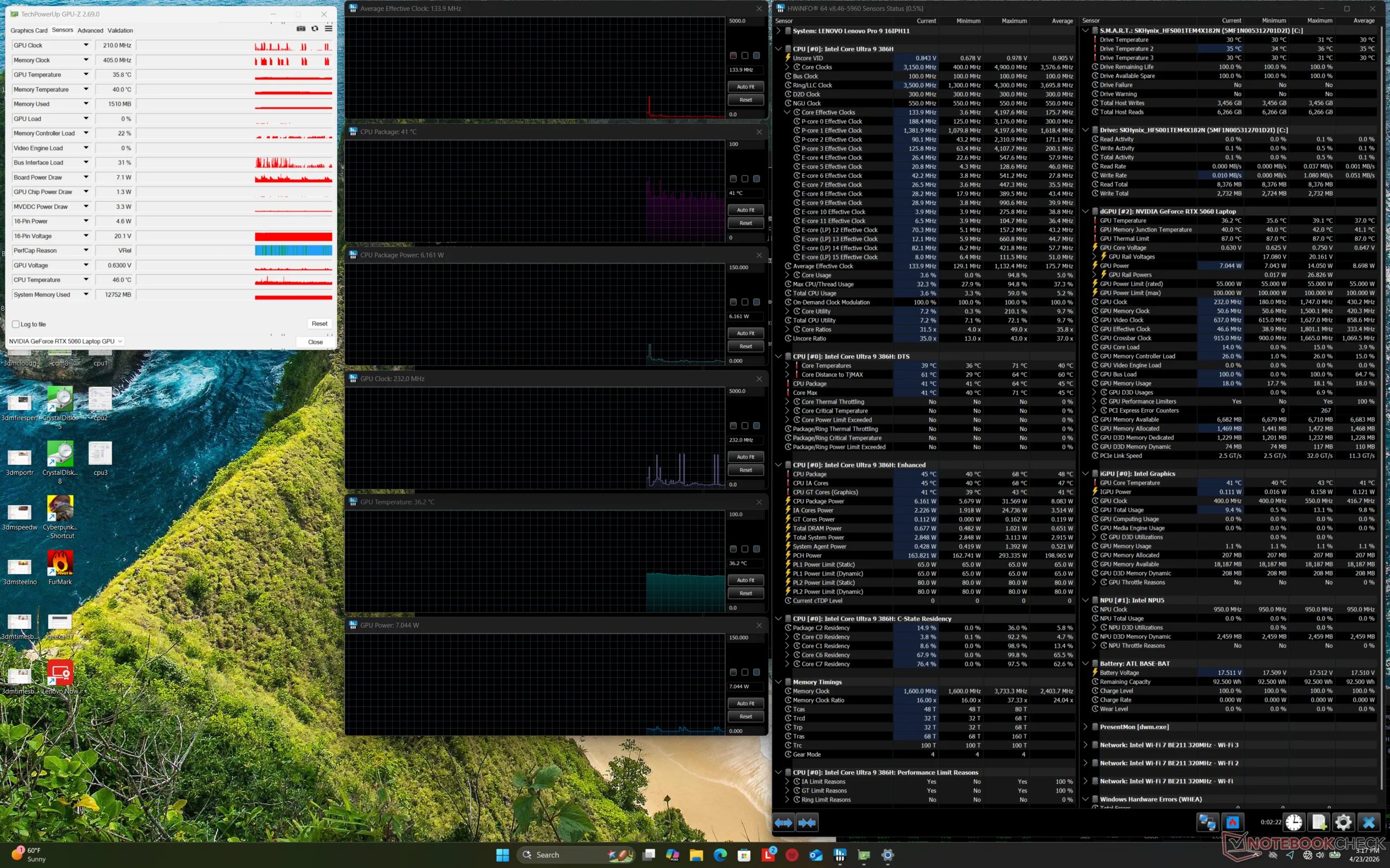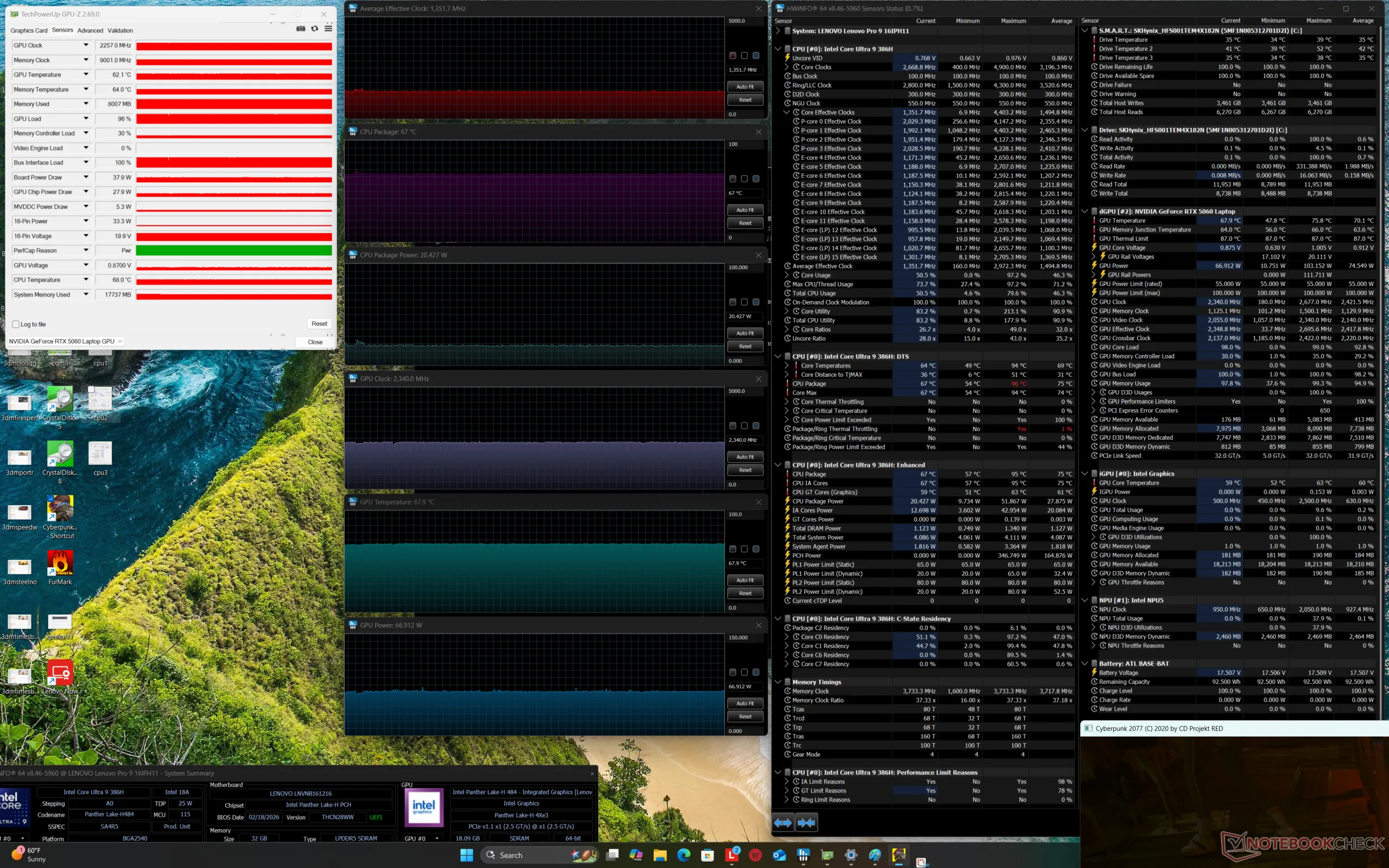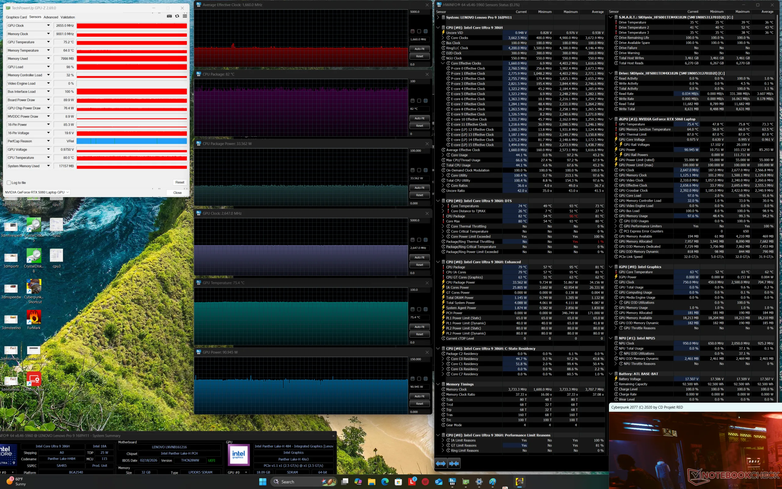 Çekirdek sıcaklığı ve saat hızları, aşağıdaki ekran görüntülerinde gösterildiği gibi Dengeli ve Performans modları arasında büyük ölçüde değişir. Örneğin Cyberpunk 2077 çalıştırılırken GPU, Performans moduna ayarlandığında ortalama 2647 MHz, 75 C ve 91 W, Dengeli moda ayarlandığında ise 2340 MHz, 68 C ve 67 W değerlerine ulaşıyordu. Dengeli moddaki genel yavaş performans, yukarıdaki GPU bölümündeki Time SPy gözlemlerimizle uyumludur.