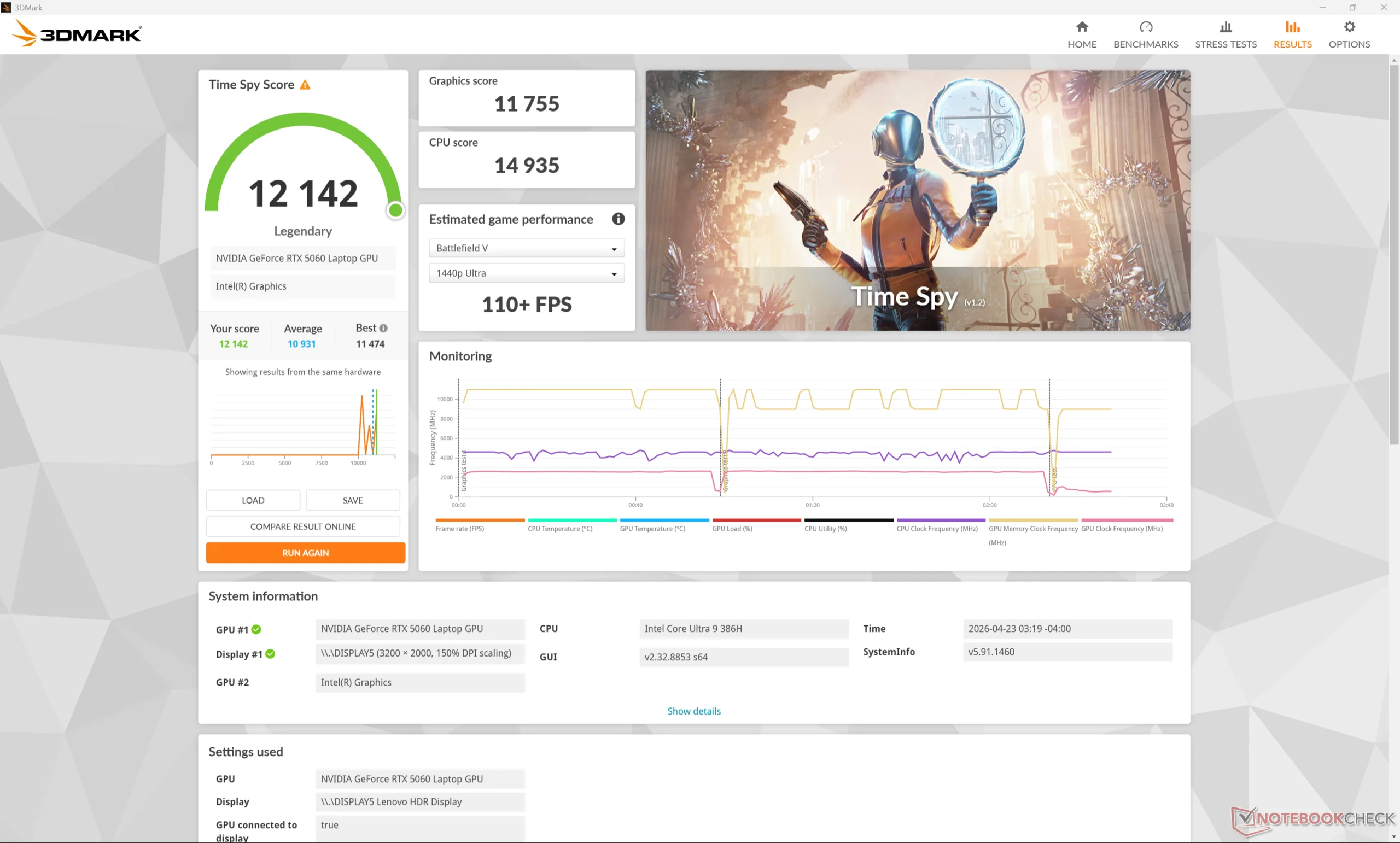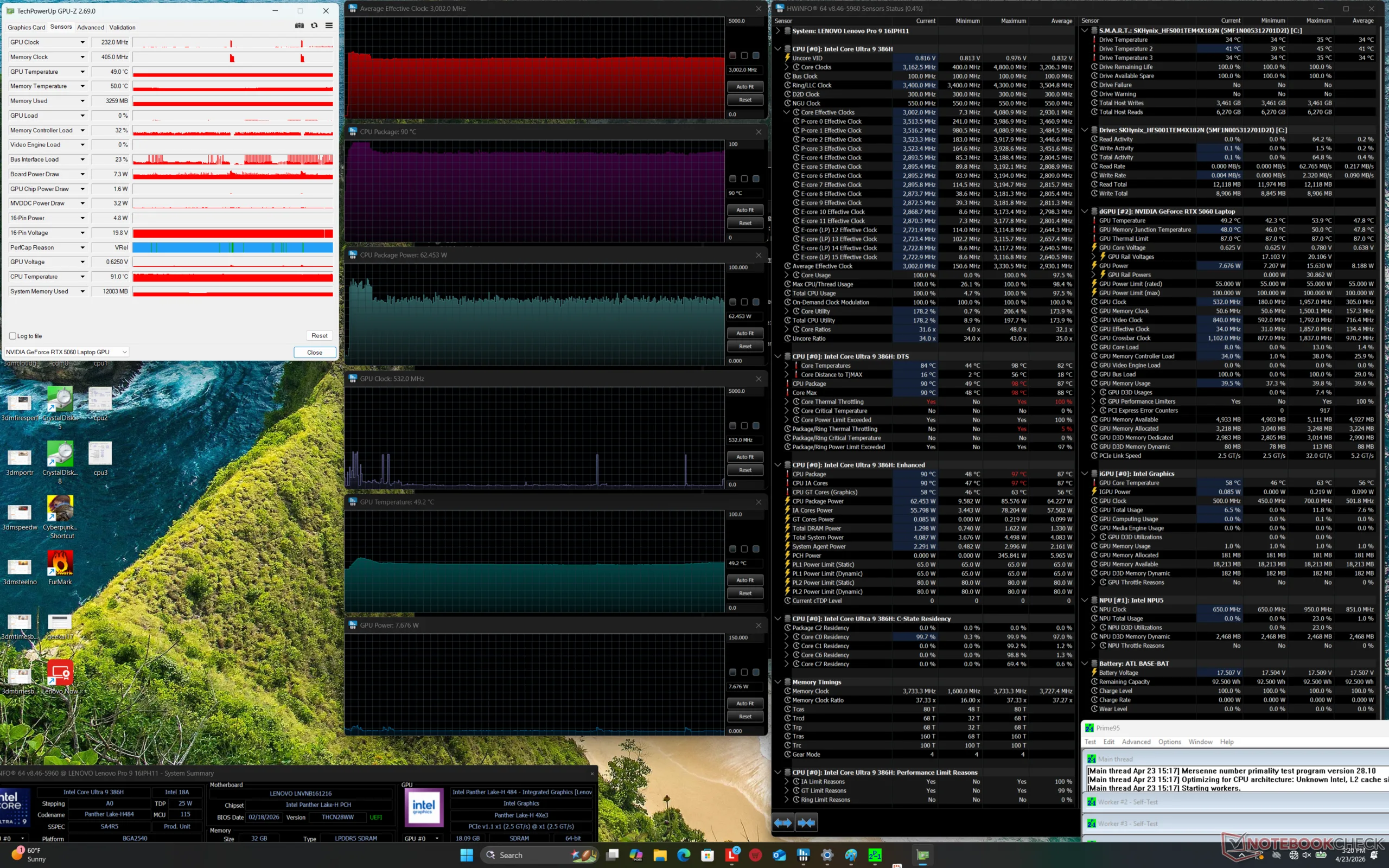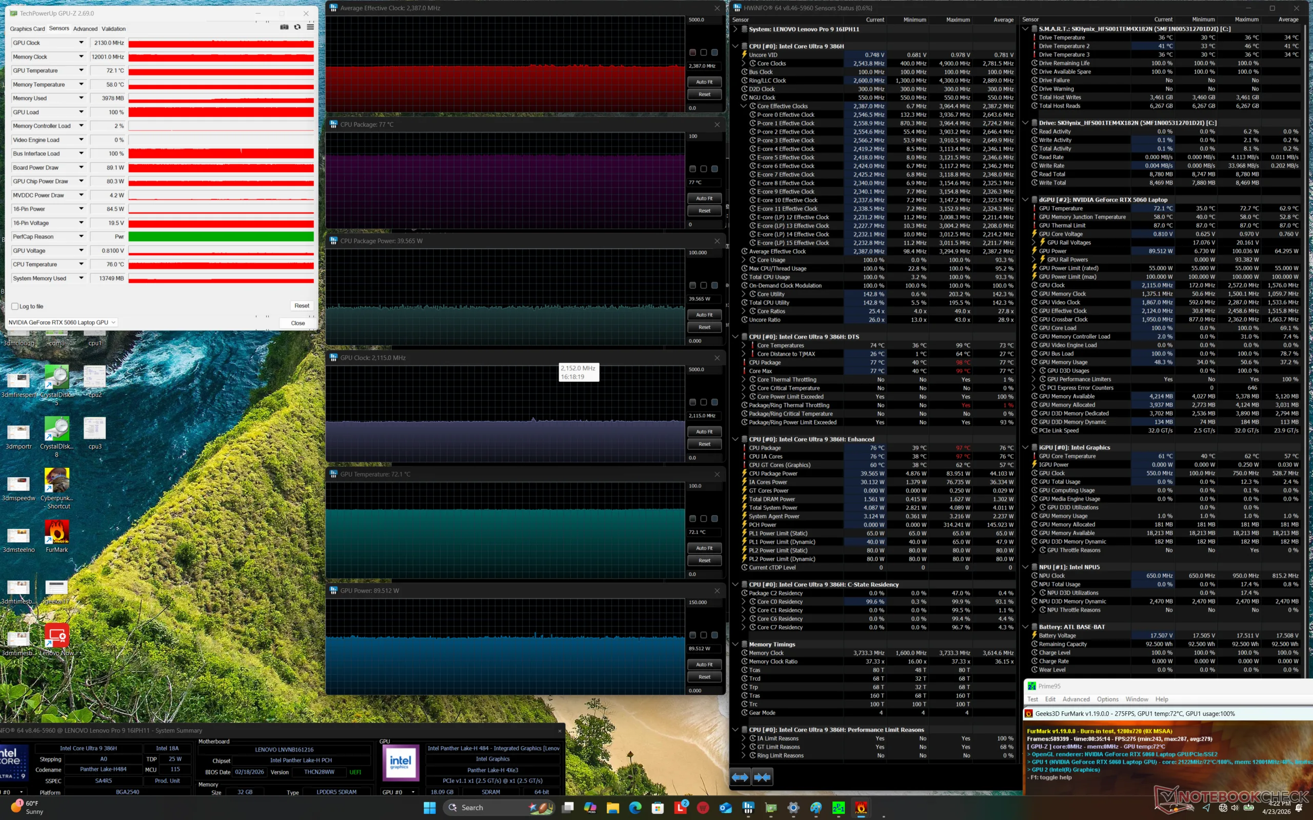 Çekirdek sıcaklığı ve saat hızları, aşağıdaki ekran görüntülerinde gösterildiği gibi Dengeli ve Performans modları arasında büyük ölçüde değişir. Örneğin Cyberpunk 2077 çalıştırılırken GPU, Performans moduna ayarlandığında ortalama 2647 MHz, 75 C ve 91 W, Dengeli moda ayarlandığında ise 2340 MHz, 68 C ve 67 W değerlerine ulaşıyordu. Dengeli moddaki genel yavaş performans, yukarıdaki GPU bölümündeki Time SPy gözlemlerimizle uyumludur.
