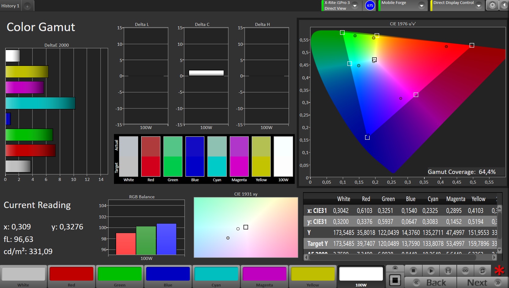 Saf beyaz bir arka planla, ADS paneli ortalama 361 cd/m² (maksimum 411 cd/m²) ile parlıyor ve rakiplerine göre iyi bir performans sergiliyor. Açık ve koyu görüntü alanlarının eşit dağılımıyla (APL18 ölçümü) parlaklık 420 cd/m²'ye kadar çıkıyor.