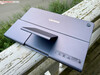 Tabletin iki farklı kasa yüksekliğine sahip olma bilmecesinin arkasındaki neden sadece entegre ses sistemi değil, aynı zamanda entegre destek ayağıdır. Alt arka kapağın ortasında yer alan destek ayağı, mekanik menteşeleri üzerinde neredeyse 180 derece katlanabiliyor ve konumunu sıkıca koruyor. Bu, Lenovo tabletin çok esnek bir şekilde desteklenmesine olanak tanıyor - ancak bu yalnızca yatay modda gerçekten iyi çalışıyor. Gerekirse 90 derecelik açı portre modunda da kullanılabilir, ancak bu oldukça sallantılı bir olaydır.