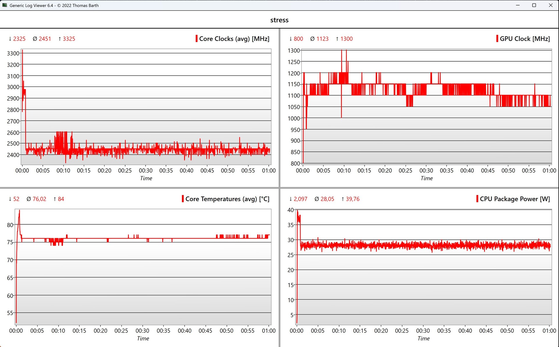 Lunar Lake modeli, Arrow Lake E14'e göre güç tüketimi avantajına sahiptir. Yük altında, 48 watt civarına hızla yerleşmeden önce 61 watt'ta zirve yapar. Birlikte verilen 65 watt'lık güç adaptörü bu nedenle fazlasıyla yeterli.