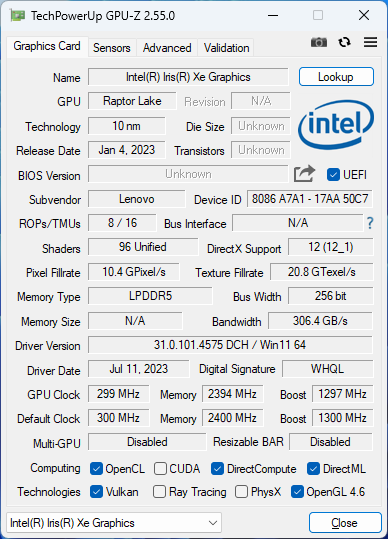 Intel inceleme birimimiz, 13. nesil Raptor Lake-U Core i7-1355U CPU, 16 GB RAM ve 1200p IPS dokunmatik ekrana sahip yaklaşık 1400 ila 600 USD perakende satış fiyatına sahip üst düzey bir yapılandırmadır. Diğer konfigürasyonlar Core i3-1315U'dan vPro'lu Core i7-1365U'ya kadar değişiyor, ancak tüm seçenekler entegre grafikler ve 1200p ekranla sınırlı.