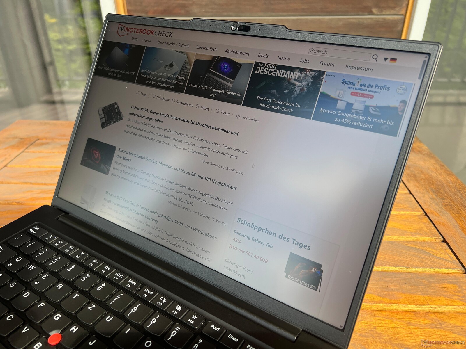 Lenovo 430 cd/m²'lik bir parlaklığın reklamını yapıyor, ancak bunu yalnızca ekranın merkezinde doğrulayabildik. Ortalama olarak parlaklığı 400 cd/m²'nin biraz üzerinde. Ekranın siyah değeri 0,32 cd/m² ve maksimum kontrast oranı 1.400,1'in biraz altında. Bunlar genel olarak makul değerlerdir, ancak gerçekten iyi de diyemezsiniz. Bu durum rakiplerle kıyaslandığında da görülebilir, çünkü yeni HP ZBook Firefly G11örneğin, 120 Hz ekranıyla (çözünürlüğü biraz daha düşük olsa bile) 550 cd/m² civarında bir parlaklığı yönetir. Lenovo'nun sunduğu başka paneller de var, örneğin 165 Hz'de üstün mini LED panel Yoga Pro 9i 14 (ayrıca 14,5 inç, 3.072 x 1.920 piksel).