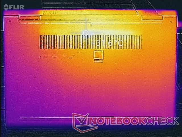 Surface temperature can become as warm as 40 C to 44 C near the center of the keyboard when running high loads for extended periods. Interestingly, these results are almost the same as what we recorded on the Yoga Slim 7 with the more powerful GeForce MX350 GPU. Expect warm keyboard keys if gaming, but the warmth isn't bothersome otherwise.