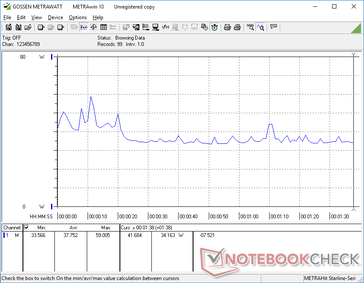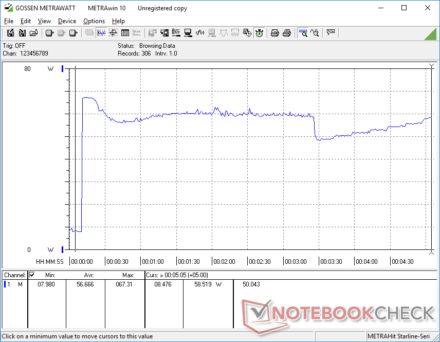 We're able to measure a temporary maximum draw of 67.3 W from the small (~11.8 x 4.8 x 3 cm) 65 W AC adapter when running Prime95. The system will still recharge albeit more slowly when under such high loads.