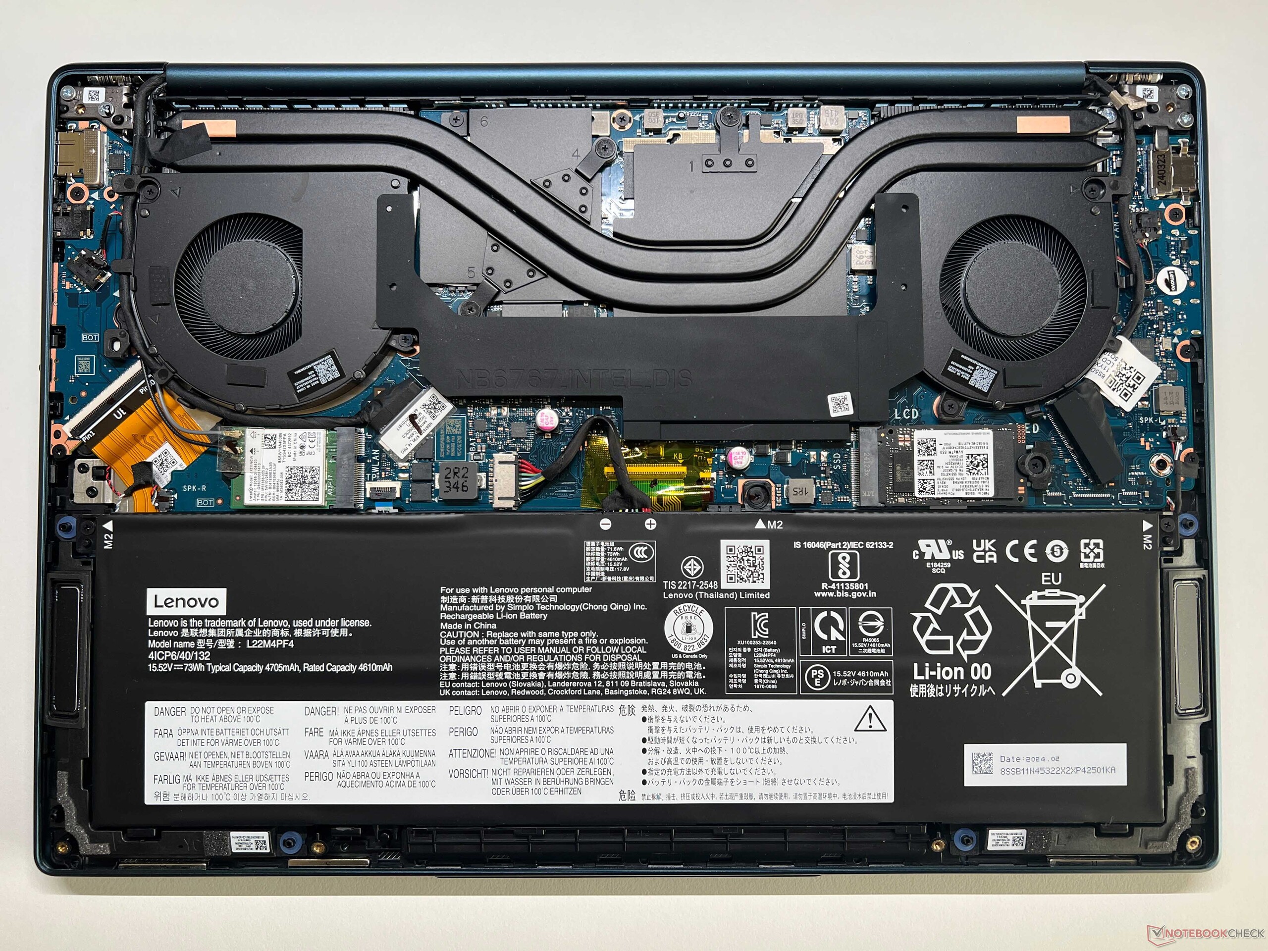 RAM lehimlenmiştir, bu nedenle bakım seçenekleri WLAN modülü, kompakt M.2-2242 SSD (iGPU sürümleri için M.2-2280) ve fanların temizlenmesi ile sınırlıdır. Gerekirse vidalı pil de değiştirilebilir. Tüm önemli bağlantı noktaları yerleşiktir (Thunderbolt 4 dahil) ve 1080p web kamerası (IR sensörü ve elektronik deklanşör dahil) Windows Studio Effects'i destekler. Wi-Fi modülü Wi-Fi 6E standardına uygundur ve testimiz sırasında yüksek aktarım hızlarına ulaşmıştır; ancak dizüstü bilgisayarda kart okuyucu yoktur.