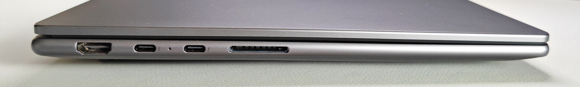 Intel test cihazımız gri renkte, ancak bunun dışında kasa AMD versiyonundan farklı değil. Beklendiği gibi, bağlantılar için Thunderbolt 4 desteği sağlanıyor, ancak sol taraftaki tam teşekküllü SD kart okuyucu biraz daha şaşırtıcı. Aktarım hızları ortalama ~80 MB/s, ancak kartlar çok uzağa takılamıyor ve çok gevşek bir şekilde oturuyorlar, bu yüzden hafıza kartları hızlı bir şekilde düşebiliyor.