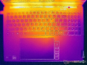 Zorlu yükleri çalıştırırken sıcak noktalar 41 C'nin üzerine çıkabilir, bu da bizim kaydettiğimizden birkaç derece daha soğuktur Asus VivoBook Pro 16 aynı RTX 4050 GPU ile.