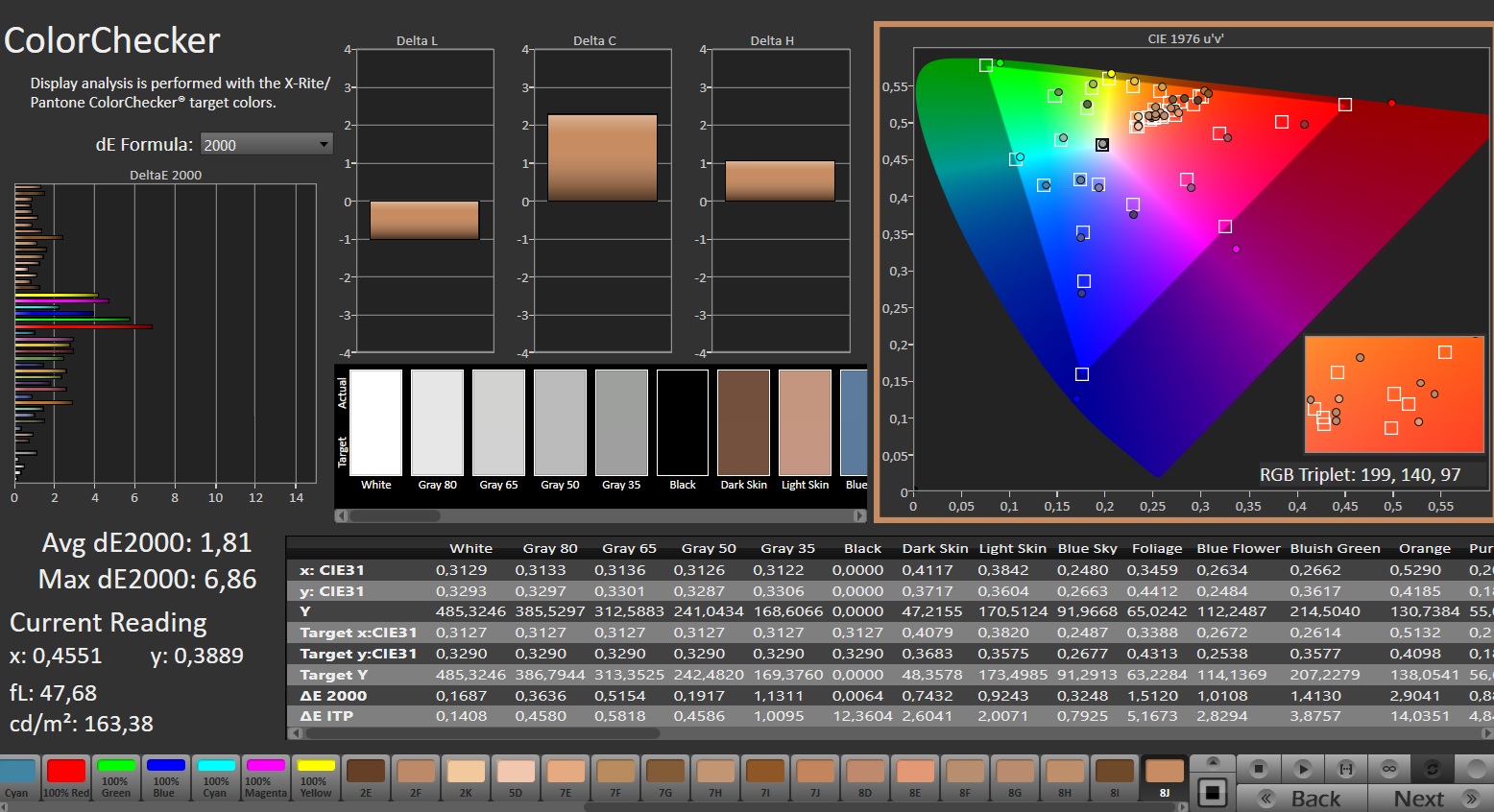 | Colorchecker dE 2000 max. * | 6.79 | 2.3 66% | 3.8 44% | 6.38 6% |
