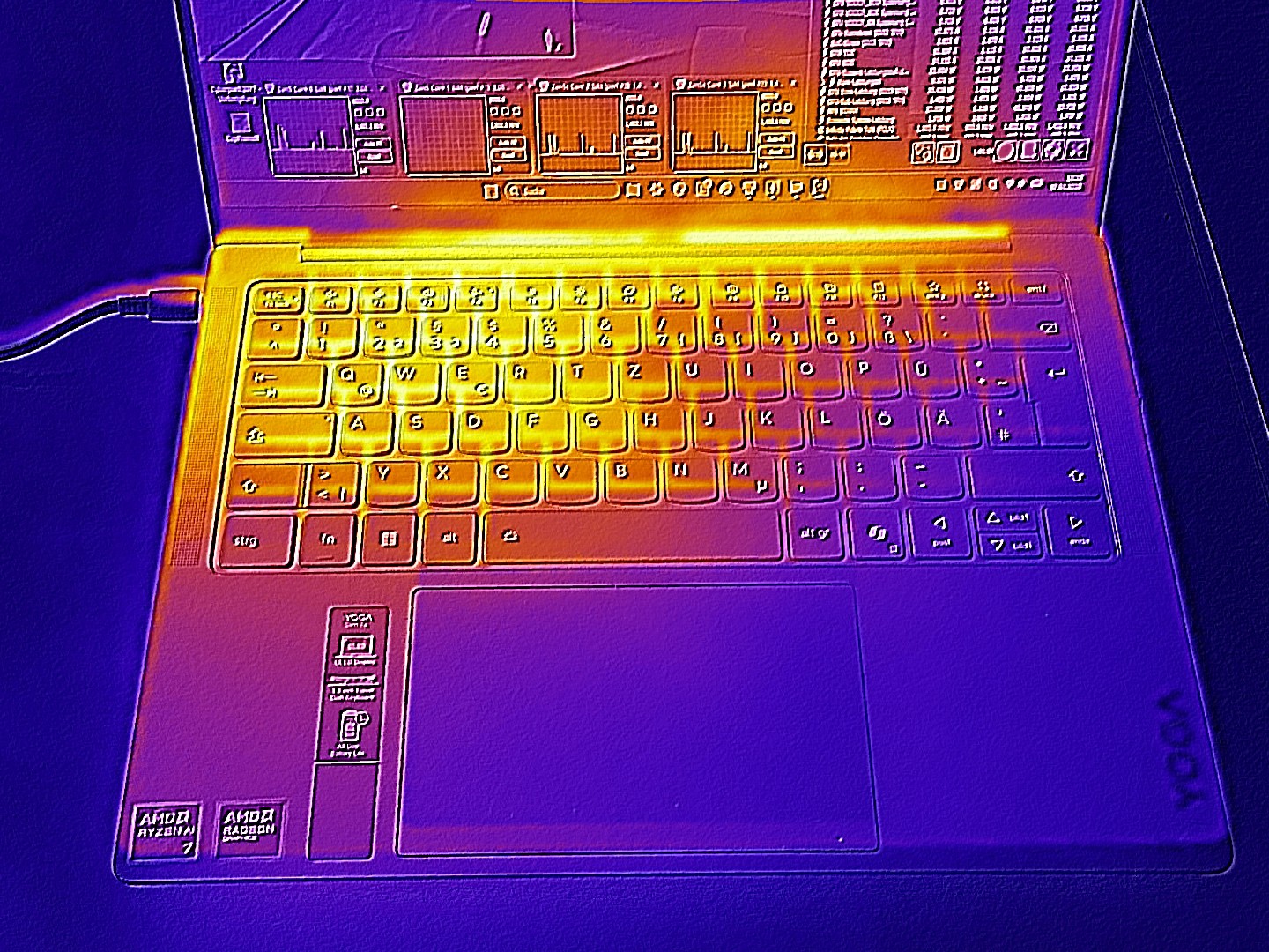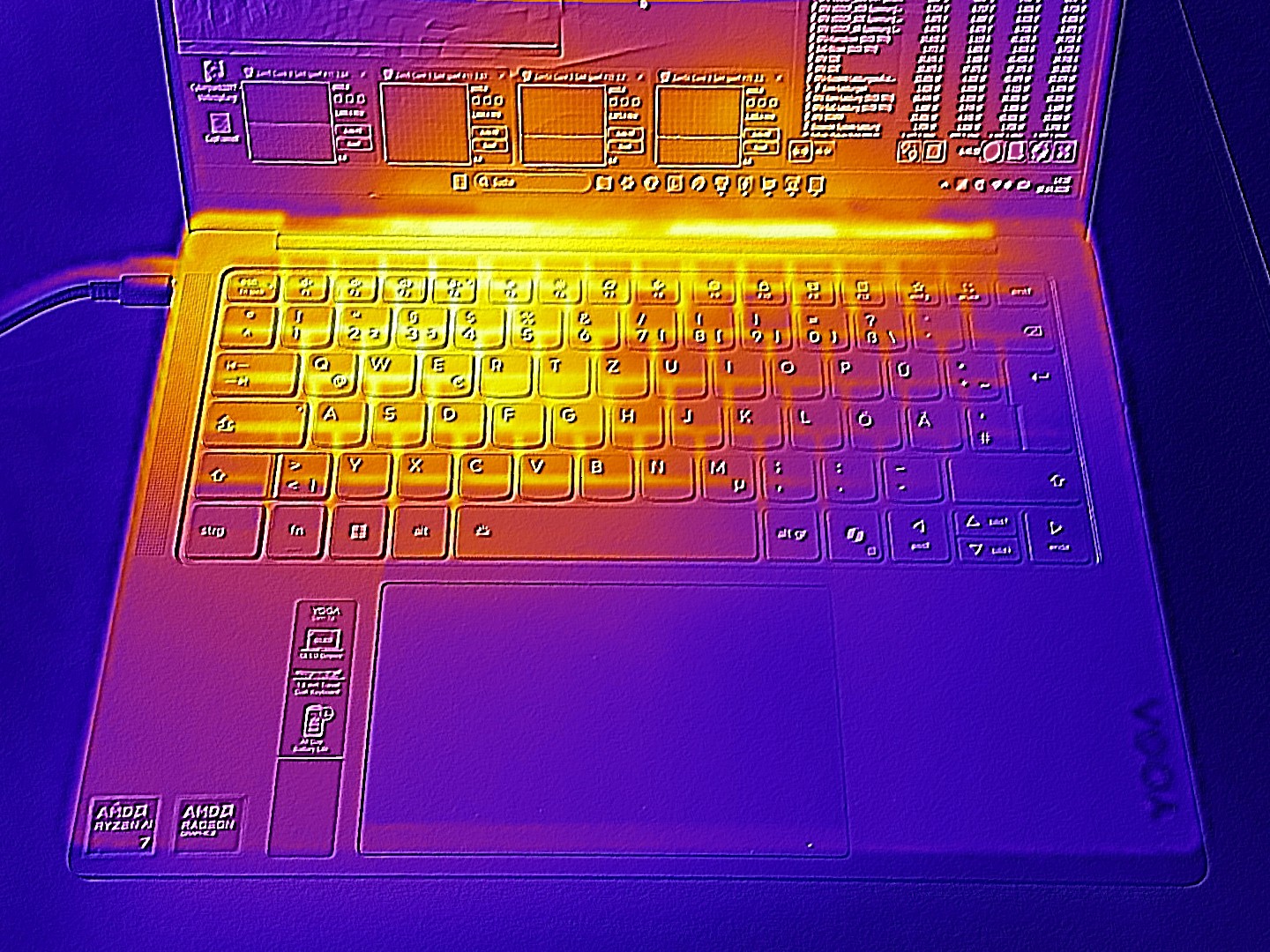 Sıcaklık durumu da benzerdir. Kasa rölanti modunda 30 °C'nin altında kalırken, oyun oynarken münferit alanlar 45 °C (üstte) ve 46 °C'ye (altta) kadar ısınıyor.