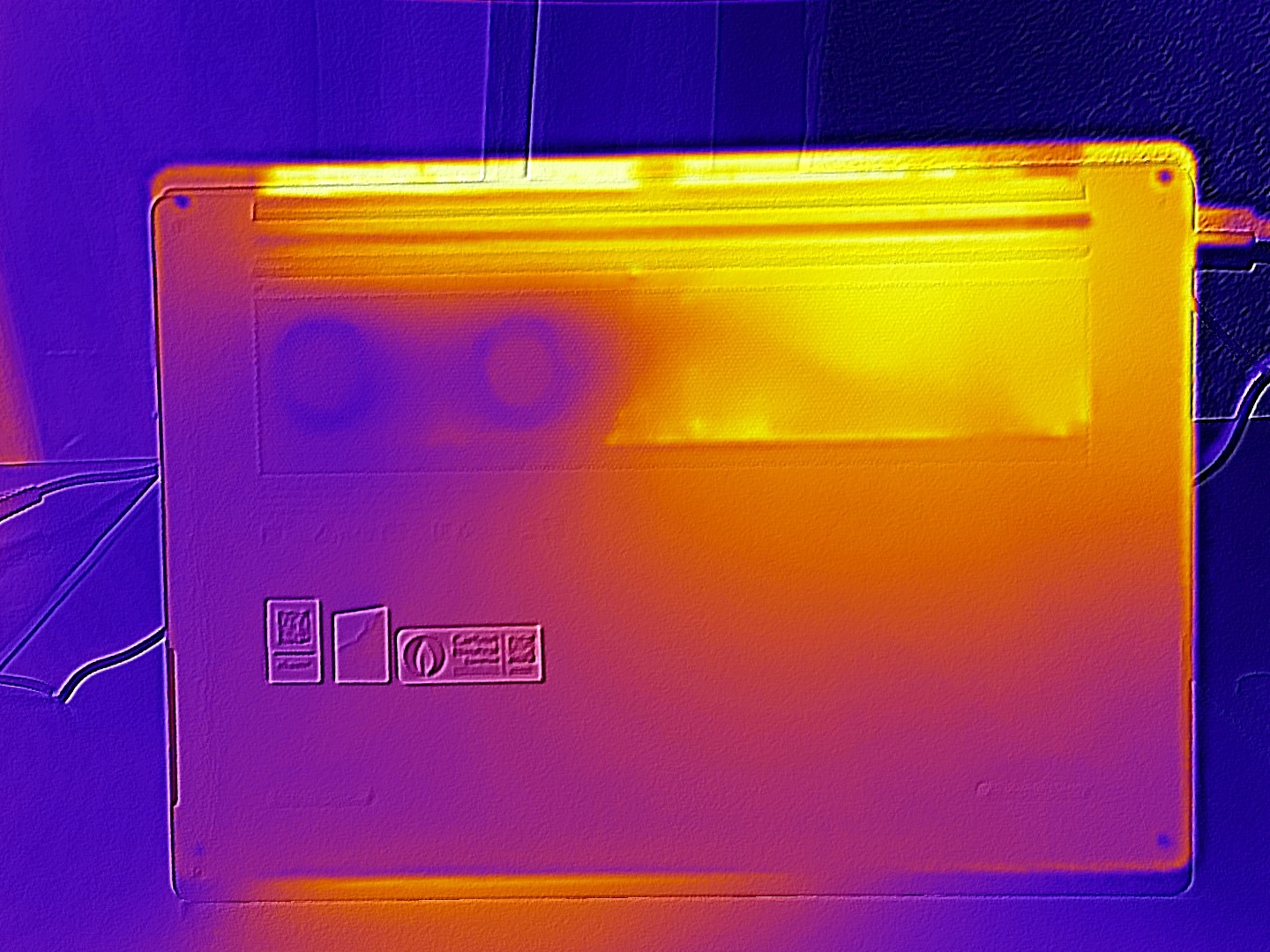 (±) 3: The average temperature for the upper side is 37.7 °C / 100 F, compared to the average of 30.8 °C / 87 F for the class Subnotebook.
