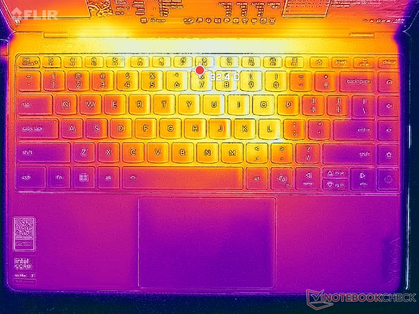 Yüzey sıcaklıkları genellikle diğer 14 inç alt dizüstü bilgisayarlara göre beklenenden daha soğuktur. Sıcak noktalar, Yoga Pro 7 14 G9 ve Yoga Pro 7 14 G9'daki 42 C ve hatta 49 C'ye kıyasla, klavye desteğinde ve alt kapakta sırasıyla 34 C ve 41 C'nin biraz üzerine ulaşabilir Vivobook S 14 OLEDsırasıyla. Sıcak noktalar da kasanın arka yarısına doğru ve bu nedenle sıcaklık artışı normal kullanım sırasında endişe verici değil.
