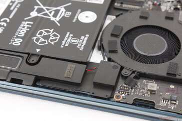 Alt panel dört Torx vida ve yapıştırılmış kauçuk ayakların altına gizlenmiş iki ek Phillips vida ile sabitlendiğinden çıkarılması zordur. Tüm vidalar çıkarılmış olsa bile panel tabana sıkıca sabitlenmiştir ve bu nedenle çıkarmak için makul miktarda güç gerekir. İçeri girdikten sonra, hem RAM hem de WLAN 2022 Yoga Slim 9i 14 Gen 9'da olduğu gibi lehimlendiğinden, kısa M.2 2242 SSD'nin ötesinde yükseltilecek fazla bir şey yoktur.
