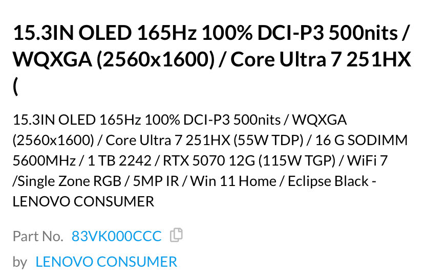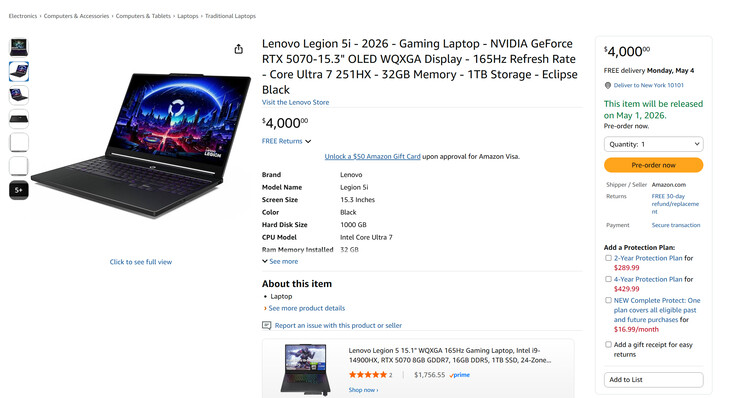 Bu arada, X kullanıcısı Huang514613, Cendirect Kanada'da ve Amazon ABD'de 4.000 dolara satılan farklı versiyonları tespit etti. Aşağıdaki resimde görüldüğü gibi Lenovo, Legion 5i'yi 15,3 inç OLED ekran, 1 TB depolama alanı ve 32 GB RAM ile Eclipse Black kaplamalı olarak listeledi. Başka bir deyişle, bu mevcut Panther Lake varyantlarının donanımıyla eşleşiyor.