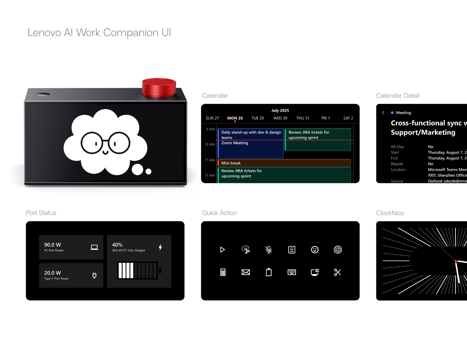 Lenovo tarafından sağlanan görüntüler, AI Work Companion Concept'in saat yüzünün özelleştirilebileceğini gösteriyor. Ayrıca, bağlı bir dizüstü bilgisayarda ne kadar pil olduğu ve tam olarak şarj olmasına ne kadar kaldığı gibi ek bilgiler de görüntülenecek. Ayrıca hesap makinesi, posta ve ChatGPT gibi uygulamalar için simgelerin yanı sıra kes, yapıştır ve mikrofon sesini kapat gibi eylemleri içeren bir hızlı eylem menüsü de var.