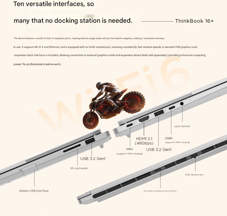 Ekran dışında, AMD destekli iki 2026 ThinkBook 16 Plus ve 14 Plus'ın diğer özellikleri aynı. Her ikisi de 8 TB'a kadar PCIe 4.0 depolama desteğine sahip ve Lenovo, AMD APU'yu 7500MT/s hızında çalışan 32 GB LPDDR5x RAM ile eşleştirdi. TGX bağlantı noktasına ek olarak, dizüstü bilgisayarlar aşağıdaki bağlantı noktalarına sahiptir: