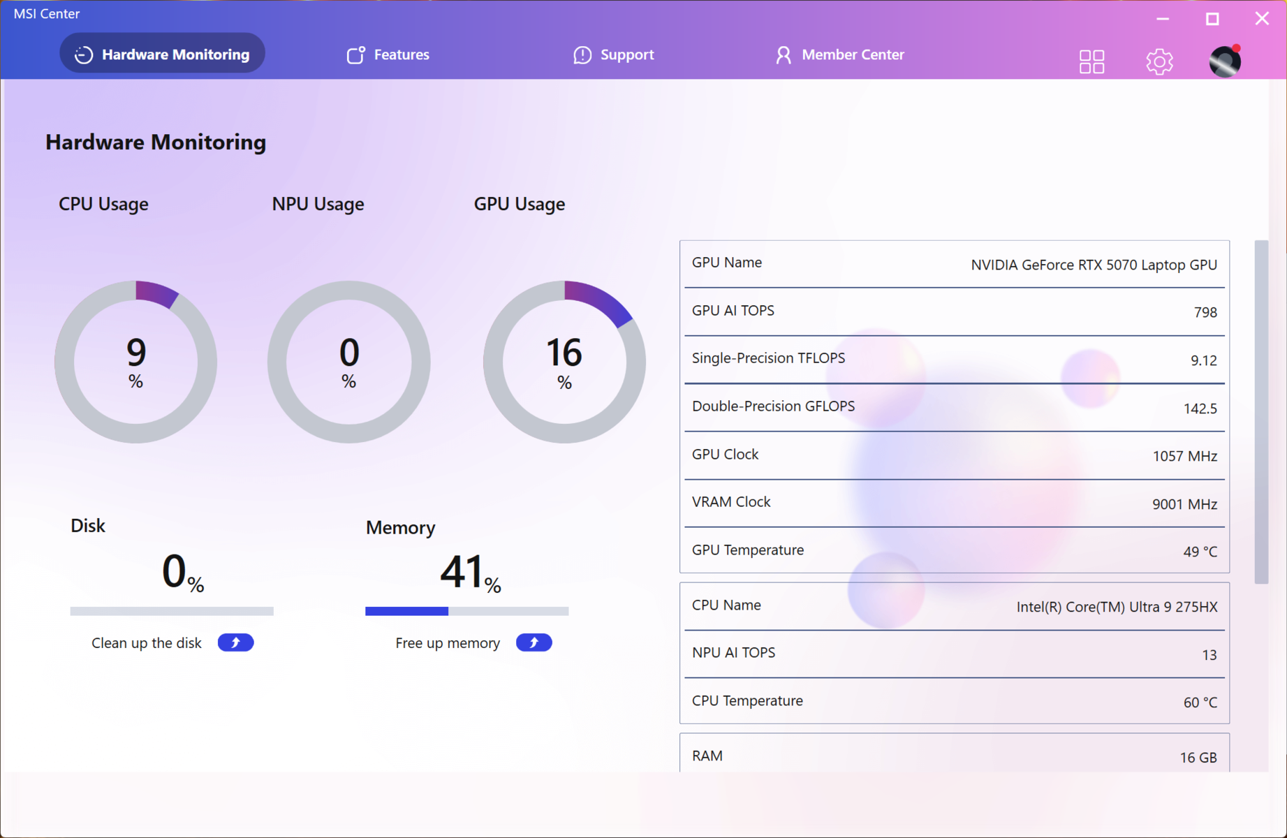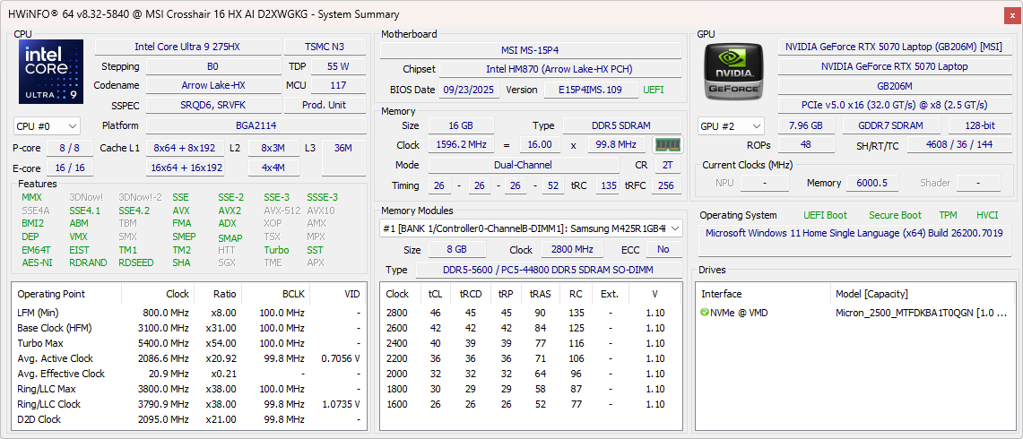 Crosshair 16 HX AI ünitemiz Core Ultra 9 275HX ve 115 W RTX 5070 Dizüstü Bilgisayar GPU'sunun yanı sıra 16 GB DDR5-5600 bellek, 1 TB NVMe SSD ve QHD+ 240 Hz IPS seviyesinde ekrana sahiptir Crosshair 16 HX D14 şasi.