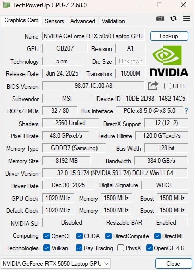 Grafik kartının gücü de tartışmaya değer: MSI, RTX 5050'ye yalnızca 45 watt'lık yetersiz bir TGP verdiğinden, GPU performansı, gürültü gelişimi sınırlı olsa da, makalenin ilerleyen bölümlerinde göstereceğimiz gibi potansiyelinin altında kalıyor. Donanımın geri kalanı sağlam, ancak Core 7 240H, 16 GB DDR5 RAM (2x 8 GB) ve 512 GB SSD ile fiyatına göre lüks değil. Bu arada, özellikle oyun dizüstü bilgisayarları için verilmeyen web kamerasının gizlilik deklanşörü için artı puanlar var.