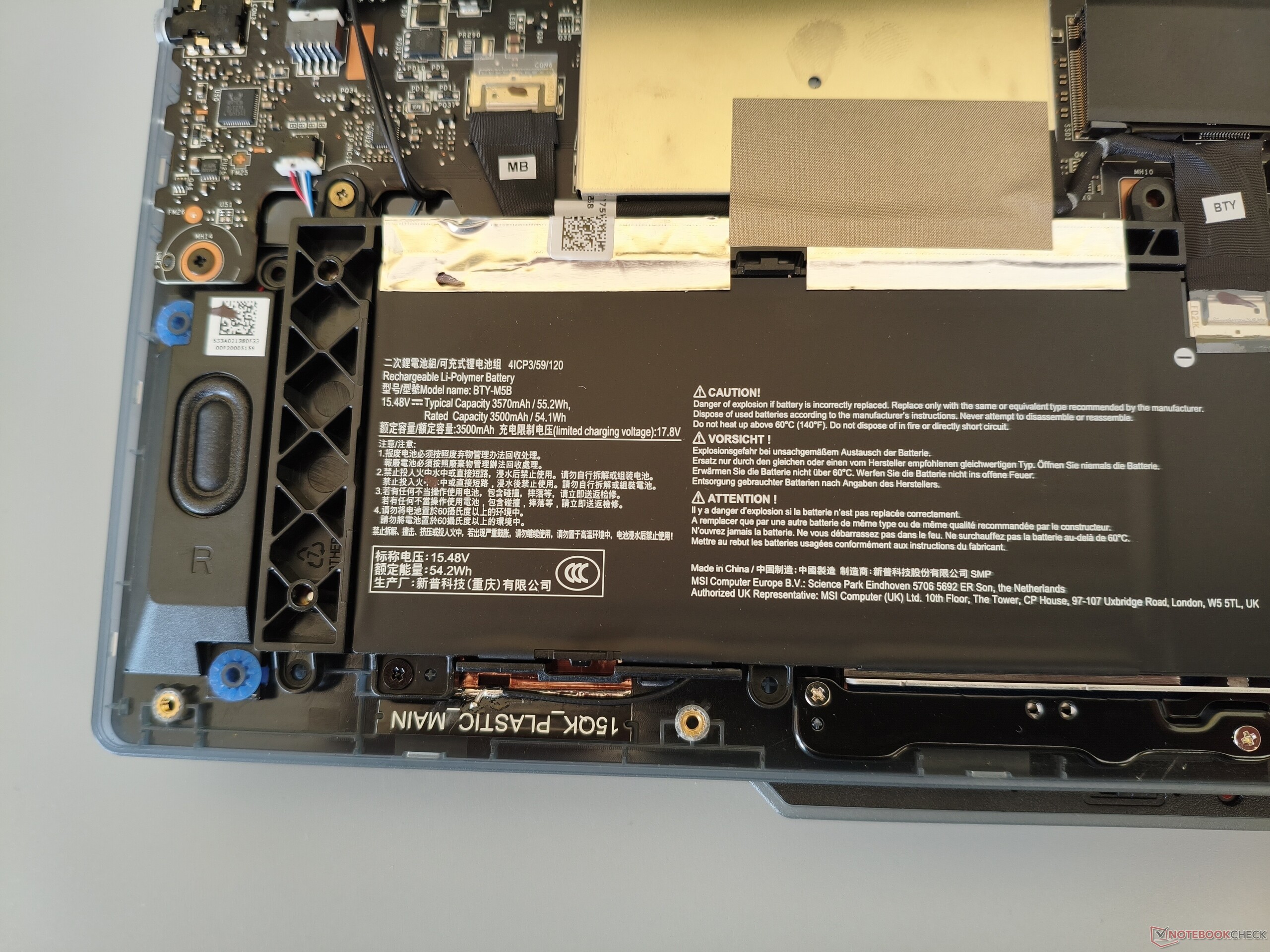 Gövde için metal (kapak) ve plastik (ana ünite) karışımı kullanılmıştır. Çoğunlukla, işçilik ve sağlamlık eleştiriye neden olmaz. MSI, 180°'lik cömert açılma açısı için özellikle övgüyü hak ediyor. Cyborg 15, 2,2 kg'ın (~4,9 lbs) biraz altındaki ağırlığıyla, 1,9 ila 2,4 kg (~4,2 ila 5,3 lbs) arasında olan rekabetin ortasında rahatça oturuyor. Kasayı açmak için 12 Phillips vidanın çıkarılması gerekiyor. Aşağıdaki resimlerde kaputun altında neye benzediğini öğrenebilirsiniz.