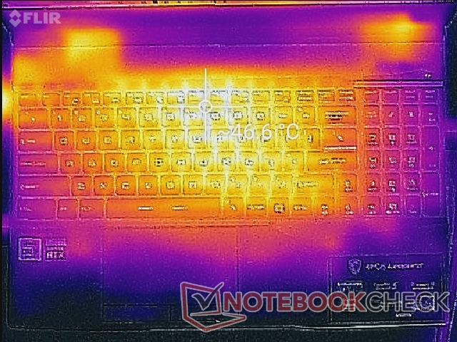 Bu daha yeni SKU daha güçlü GeForce RTX 2070 GPU ile birlikte gelmesine rağmen, yüzey sıcaklıkları geçen yıl GP65'te ölçtüğümüzle neredeyse aynı. Örneğin oyun, klavye merkezinin yaklaşık 46 C ila 49 C arasında stabilize olmasına neden oluyor. MSI'yi, Zephyrus G14 veya G15 gibi diğer oyun dizüstü bilgisayarlarının aksine alt panelde çok büyük havalandırma ızgaraları içerdiği için alkışlıyoruz.