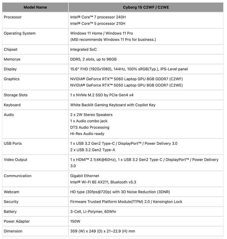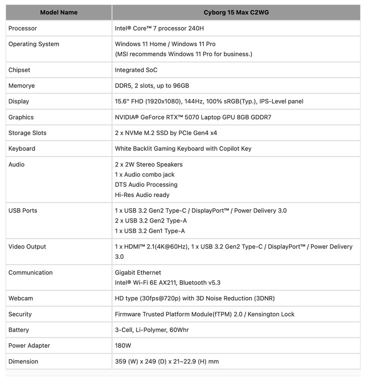 Aynı zamanda MSI, Crosshair 16 HX'i E14WGK, E14WFK ve E14WEK varyantları ile güncelledi Core i7 14650HX veya Core i9-14900HX ve 8 GB versiyonlarının GeForce RTX 5050, GeForce RTX 5060 veya GeForce RTX 5070. Ayrıca MSI, geçen yılki modellerle benzer özelliklere sahip Cyborg 15 Max, C2WG Cyborg 15 C2WF ve Cyborg 15 C2WE adlı üç yeni 15 inç Cyborg dizüstü bilgisayarı da tanıttı (Amazon'da 1.299 dolar). MSI henüz yeni modellerinin fiyatını veya bulunabilirliğini teyit etmedi. Lütfen şirketin basın bültenine bakınız daha fazla ayrıntı için.