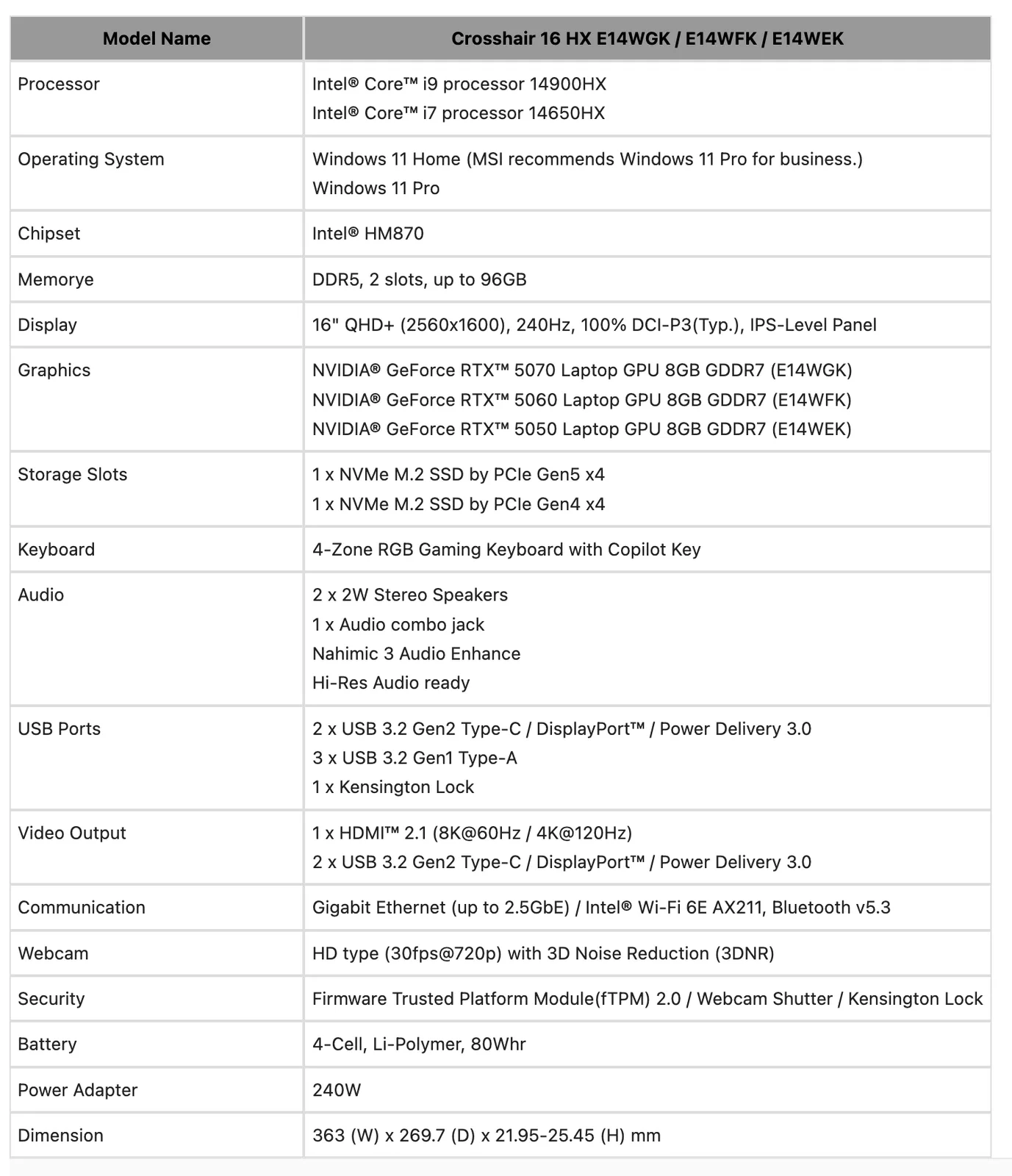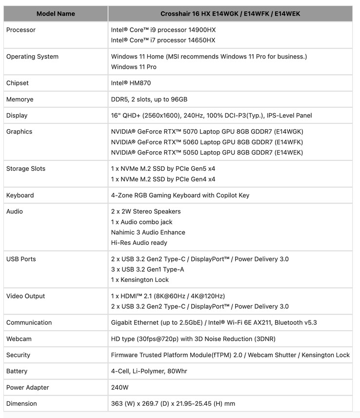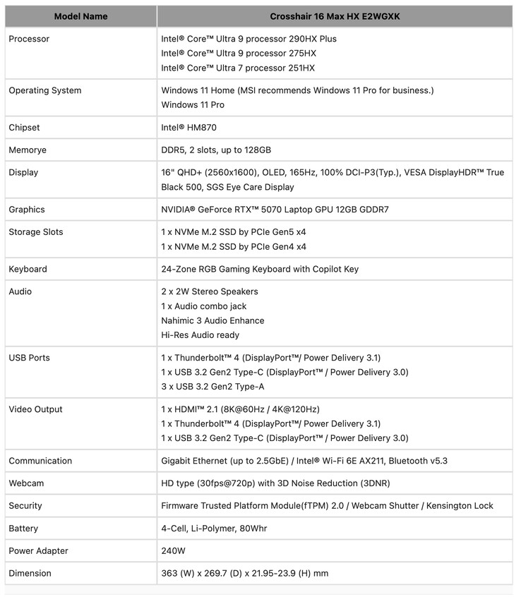 Bu arada, Crosshair 16 Max HX E2WGXK, Nvidia'nın yeni teknolojileriyle piyasaya sürüleceği doğrulanan ilk dizüstü bilgisayar piyasaya sürülmemiş 12 GB RTX 5070 dizüstü bilgisayar GPU. Bu arada, yukarıda listelenen diğer yedi dizüstü bilgisayar ya GeForce RTX 5070 Ti, GeForce RTX 5080 veya GeForce RTX 5090.