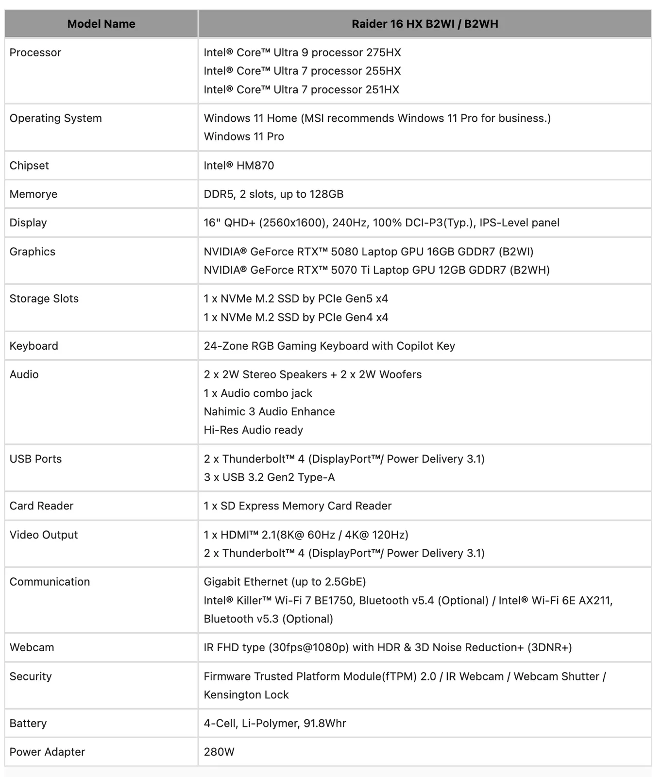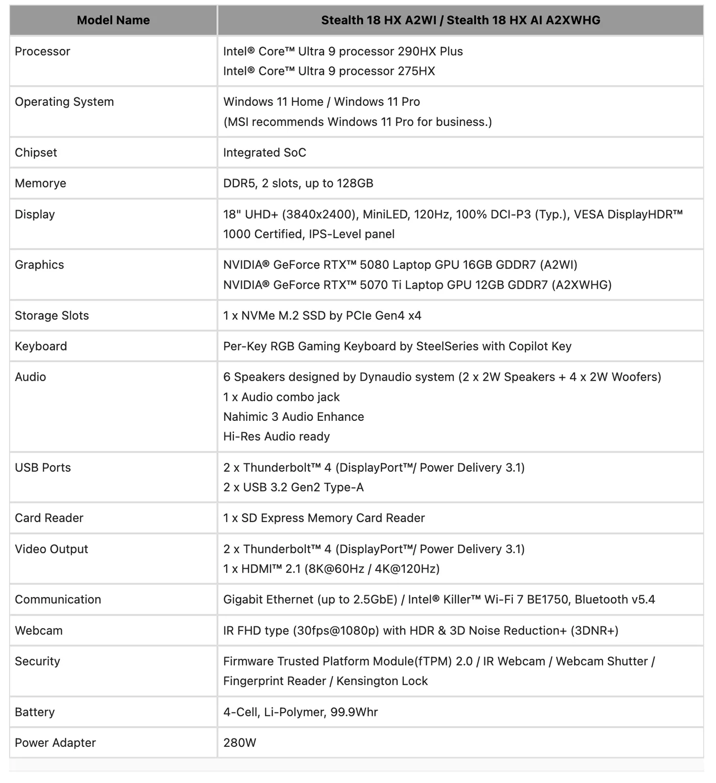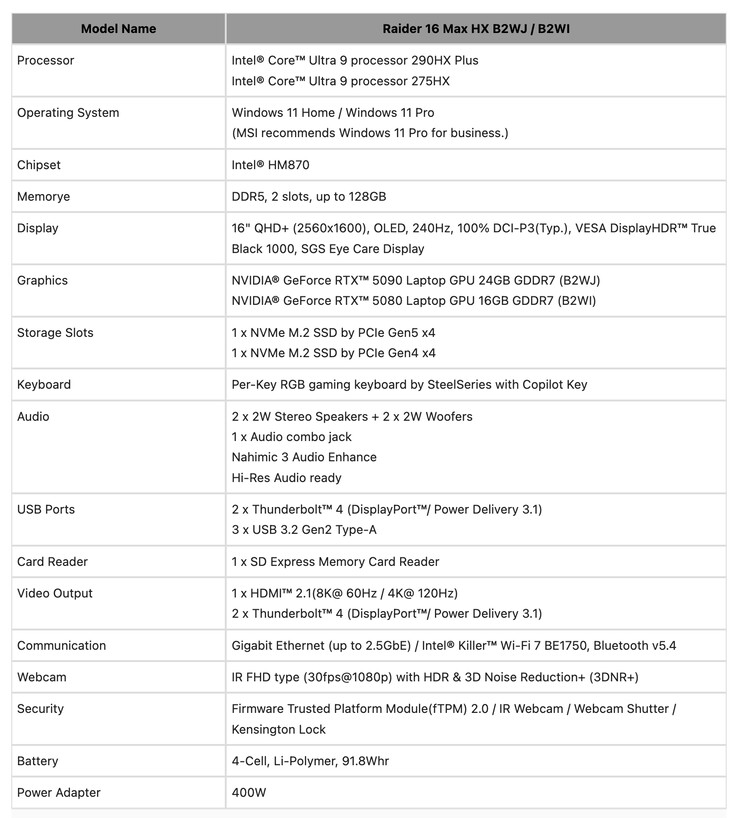 Şimdi de MSI, Raider, Stealth Titan serilerinde sekiz yeni dizüstü bilgisayarla partiye katıldı. Özellikle, şirket aşağıdaki dizüstü bilgisayarları destekleyerek sunmuştur Core Ultra 9 290HX Plus işlemciler: