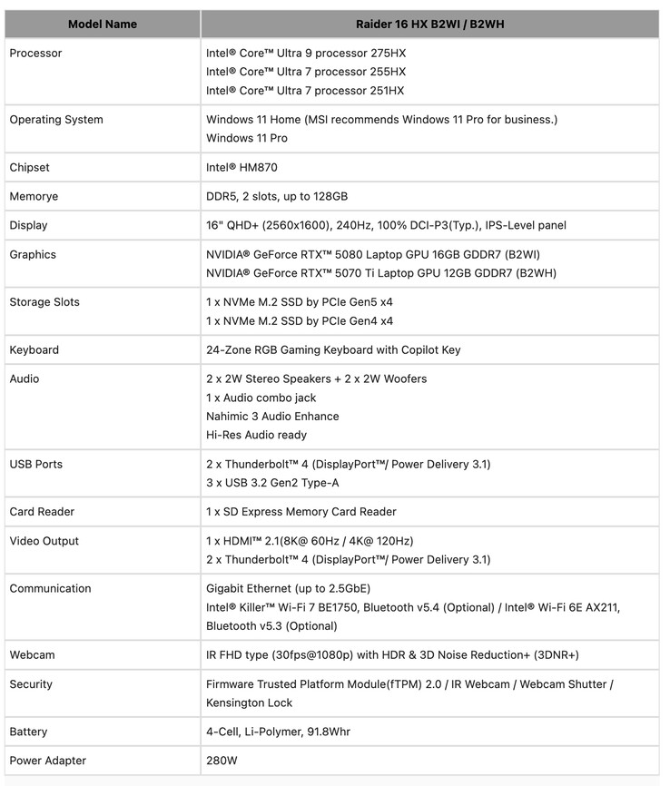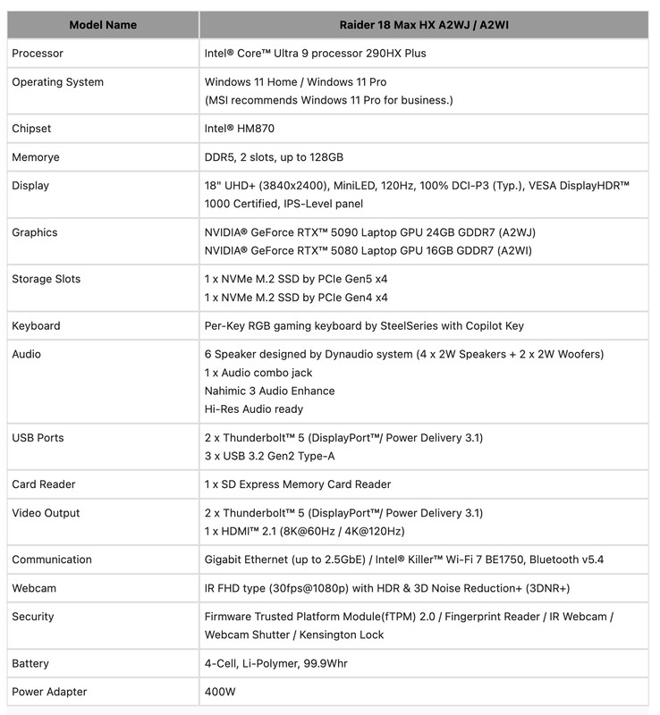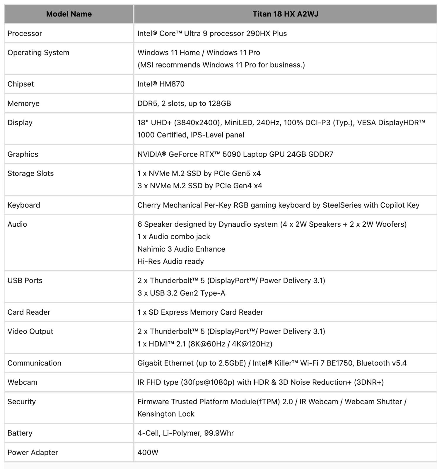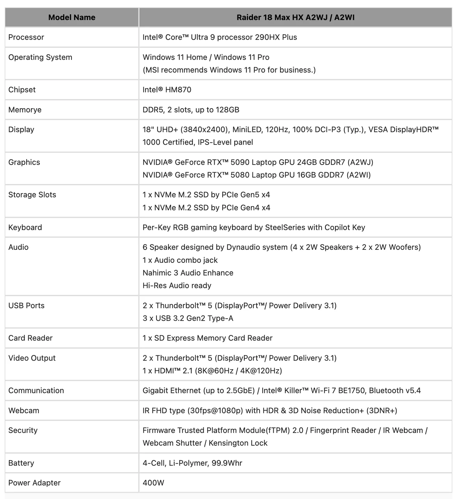 Şimdi de MSI, Raider, Stealth Titan serilerinde sekiz yeni dizüstü bilgisayarla partiye katıldı. Özellikle, şirket aşağıdaki dizüstü bilgisayarları destekleyerek sunmuştur Core Ultra 9 290HX Plus işlemciler: