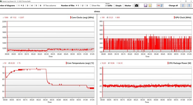 Tüketim ölçümleri sırasında göze çarpan herhangi bir sorunla karşılaşmadık ve dizüstü bilgisayarın boştaki maksimum tüketimi yaklaşık 9 watt. Tüm OLED panellerde olduğu gibi, güç tüketimini en aza indirmeye yardımcı olmak için daha koyu arka plan görüntüleri ayarladığınızdan ve Windows'un karanlık modunu kullandığınızdan emin olmalısınız. Yük altında, güç kaynağı kısa bir süre için 65 watt sınırına ulaşıyor, ardından 33 watt'ta hızla dengeleniyor ve stres testi sırasında bu seviyede kalıyor.