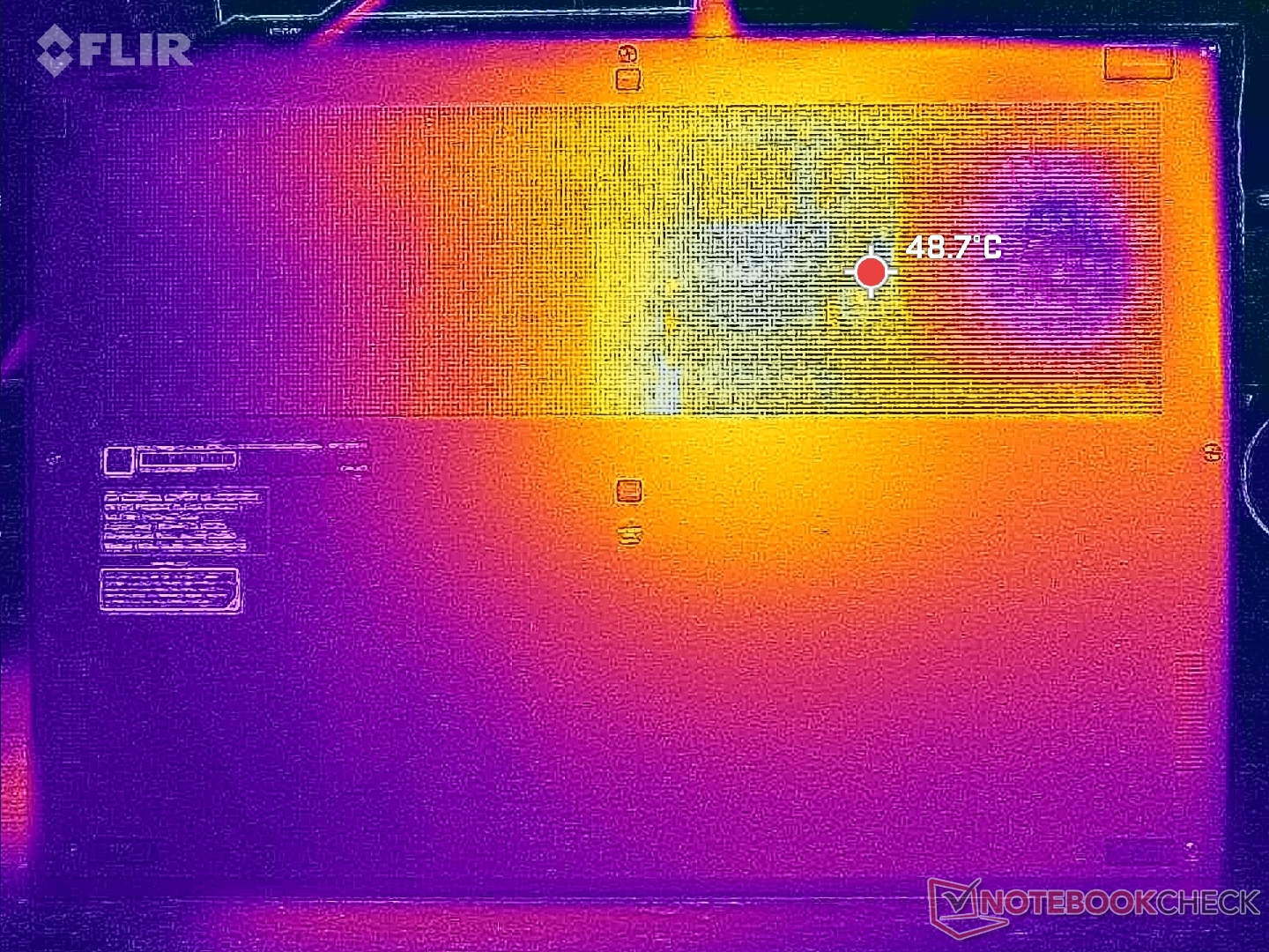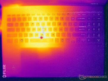 CPU'nun ve soğutma çözümünün konumlandırılması nedeniyle dizüstü bilgisayarın sol yarısında yüzey sıcaklıkları sağa göre daha yüksektir. Boşluk tuşunun yakınındaki sıcak nokta, zorlu yükleri çalıştırırken 50 C'ye kadar ulaşabilir, bu da geçen yılki Prestige 15'teki özel GeForce RTX GPU'lu sıcak noktaya benzer. Sonuç olarak WASD tuşları oyun oynarken oldukça sıcak hissedilebilir, ancak avuç içi dayanakları ve ok tuşları çok daha serin kalacaktır. Prestij dizüstü bilgisayarlar, kompakt tasarımları nedeniyle yük altında genellikle ortalama bir Ultrabook'tan daha sıcaktır ve Prestige 16 da bir istisna değildir.