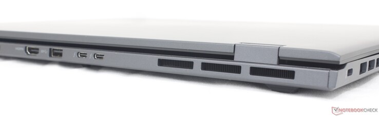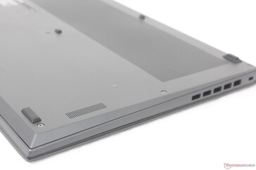 Diğer Ultrabook'ların çoğundan farklı olarak Prestige 16'daki bağlantı noktaları yanlar yerine arka kısımda toplanmıştır. Bu tasarım yaklaşımı, daha zayıf bağlantı noktası erişilebilirliği pahasına da olsa yanlar boyunca daha iyi havalandırma sağlar. HDMI, USB-C ve hatta USB-A gibi yaygın olarak kullanılan bağlantı noktalarının tümü arka taraftadır ve bu da çoğu kullanıcı için ideal olmayabilir.