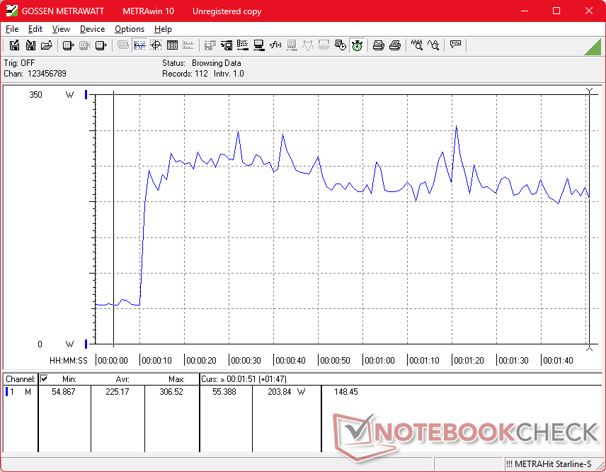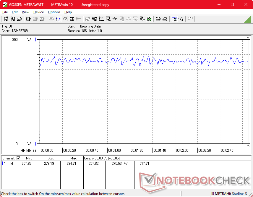 Sistem, orta büyüklükte (~16,5 x 7,5 x 2,5 cm) 280 W AC adaptör ile birlikte gönderilmektedir ve bu adaptör bu kadar zorlu bir makine için muhtemelen çok küçüktür. Bu Lenovo Legion 9 18 örneğin, aynı CPU ve GPU ile yapılandırılmış Blade 18'in her biri 330 W AC adaptör ile gönderilir. Ayrıca MSI, oyun oynarken 278 W'a kadar, hatta birlikte verilen 280 W AC adaptörden 300 W'ın üzerinde güç çekebiliyor ve bu da sistemin daha büyük bir PSU'dan faydalanabileceğini kanıtlıyor. Oyun oynarken veya diğer zorlu yükleri aynı anda çalıştırırken şarj hızları çok yavaş.