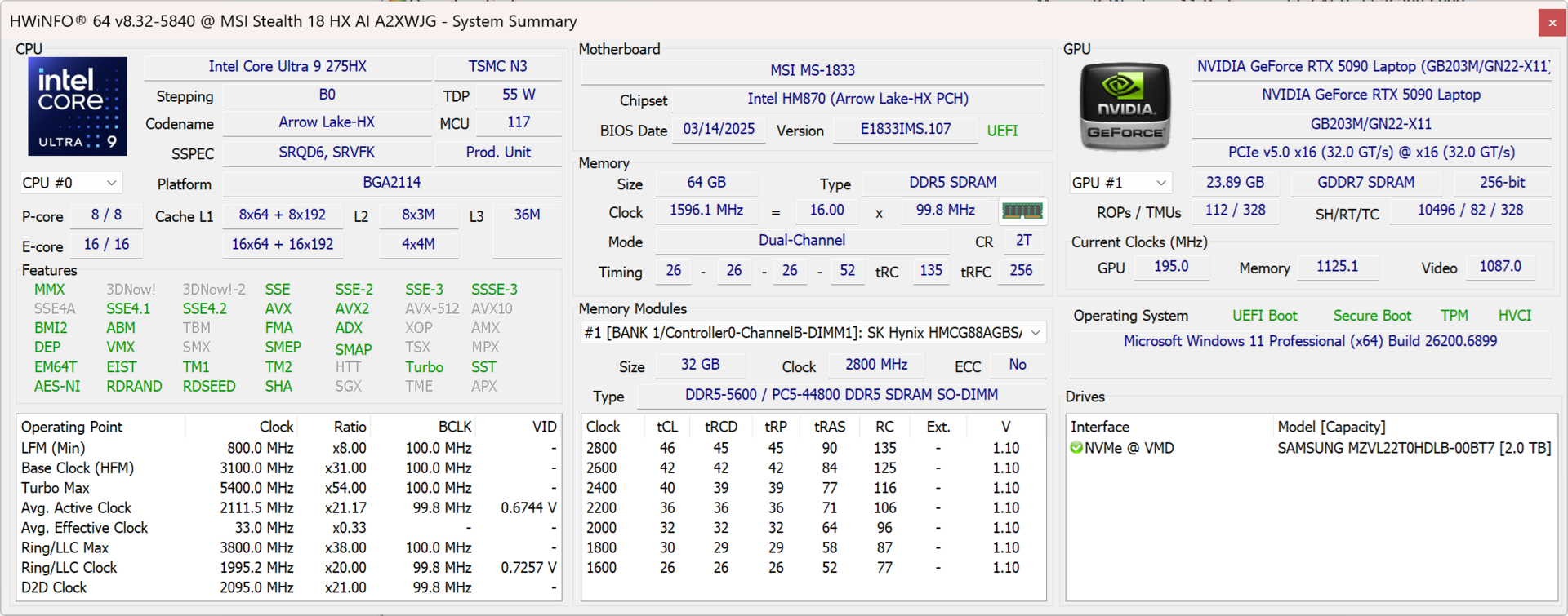 | MSI Stealth 18 HX AI A2XW Intel Core Ultra 9 275HX ⎘ NVIDIA GeForce RTX 5090 Laptop ⎘ 64 GB Bellek, 2048 GB SSD | Amazon: $4,375.00 Liste fiyatı: 4000 USD | 3 kg | 23.99 mm | 18.00" 3840x2400 252 PPI Mini-LED | |