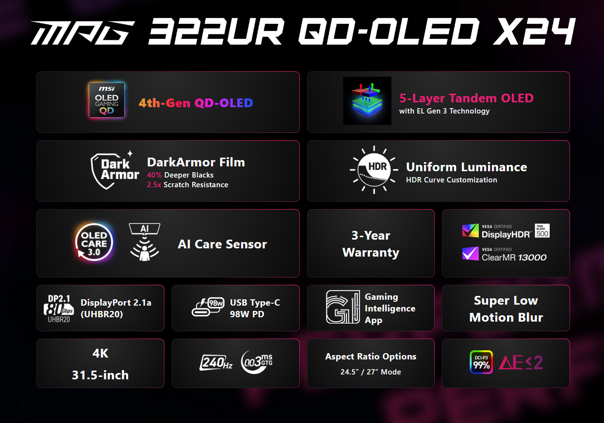Panel açısından bakıldığında, "X24" modeli bir 4. nesil tandem QD-OLED panel (muhtemelen LG tarafından) EL Gen 3 teknolojisi üzerine inşa edilmiştir. Bu 5 katmanlı kurulum, güç tüketimini azaltırken ışık verimliliğini %30 oranında artırdığını iddia ediyor. Koruma, MSI'ın çizilmeye karşı direnci 2,5 kat artırdığını ve siyahları %40 derinleştirdiğini belirttiği "DarkArmor" film ve yanmayı önlemek için insan varlığı algılanmadığında ekranı karartan NPU destekli AI Care Sensor tarafından sağlanıyor. "Gerçek zamanlı çevresel farkındalığa" dayalı olarak piksel korumasını otomatikleştirir.