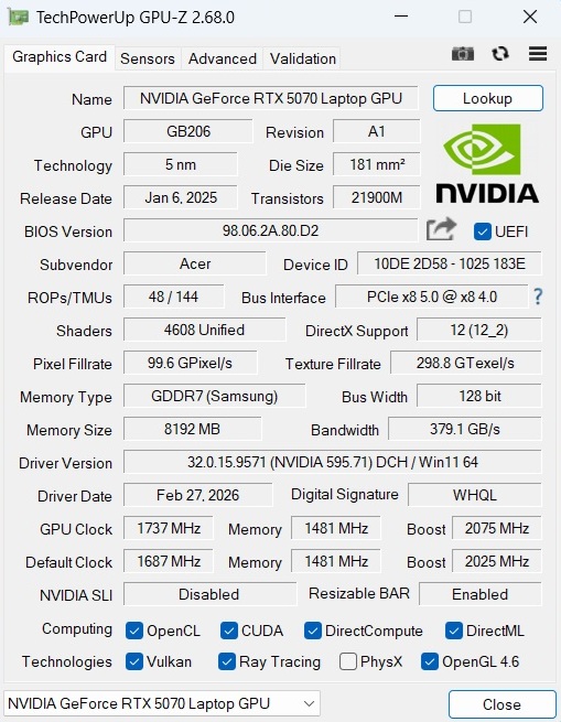 | Acer Nitro 18 AI AN18-61-R10V Ryzen AI 7 350, GeForce RTX 5070 Laptop | Asus TUF Gaming A18 FA808UP-S8022W R7 260, GeForce RTX 5070 Laptop | MSI Crosshair 18 HX AI A2XW Ultra 9 275HX, GeForce RTX 5070 Laptop | Asus ROG Strix G18 2025 G814 R9 9955HX, GeForce RTX 5070 Laptop | MSI Vector A18 HX A9W R9 9955HX, GeForce RTX 5070 Ti Laptop | |