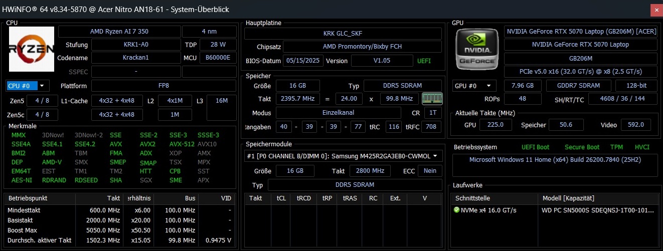 | Acer Nitro 18 AI AN18-61-R10V AMD Ryzen AI 7 350 ⎘ NVIDIA GeForce RTX 5070 Laptop ⎘ 16 GB Bellek, 1000 GB SSD | Liste fiyatı: 1900 EUR | 3 kg | 25 mm | 18.00" 2560x1600 168 PPI IPS | |