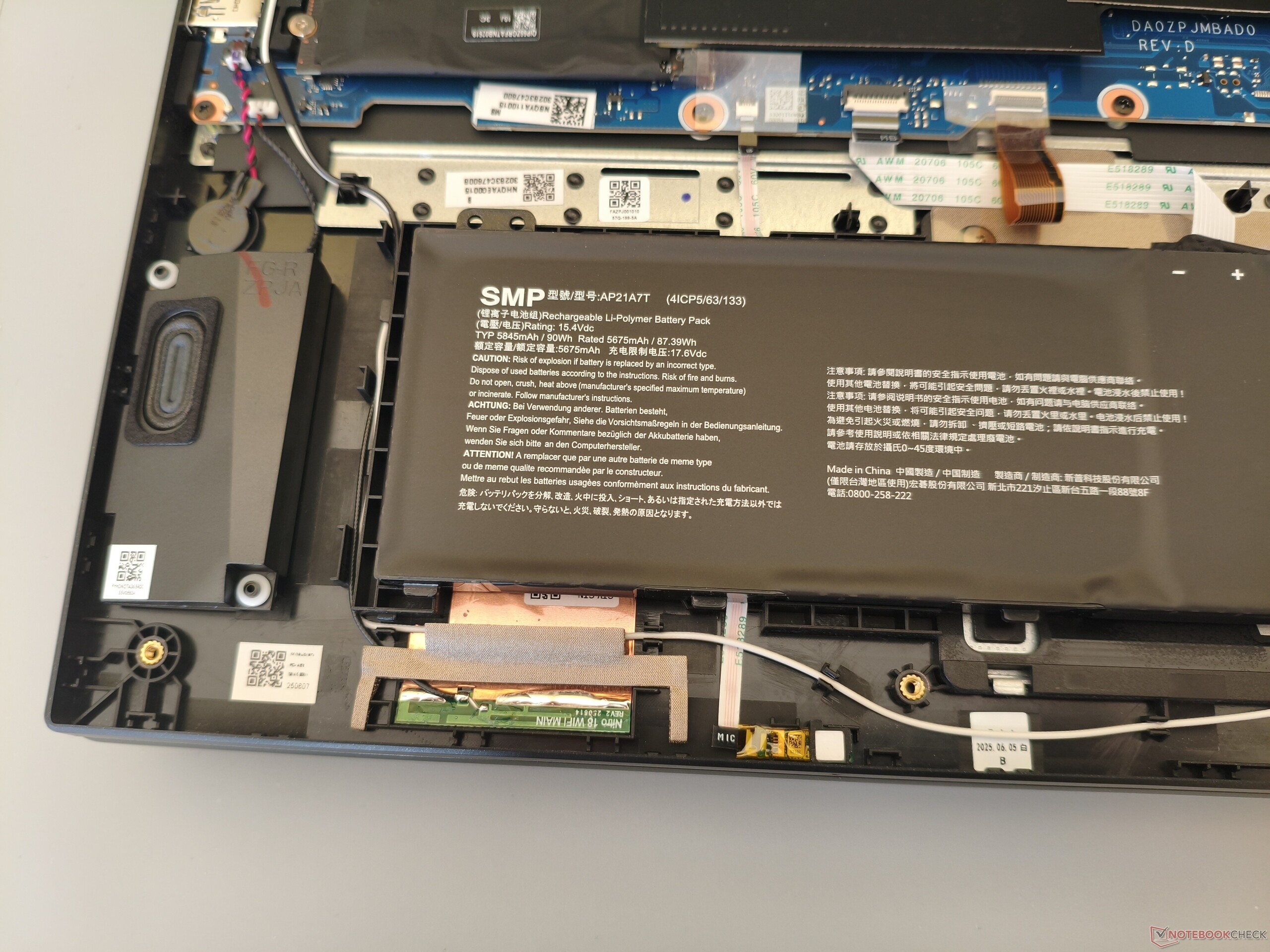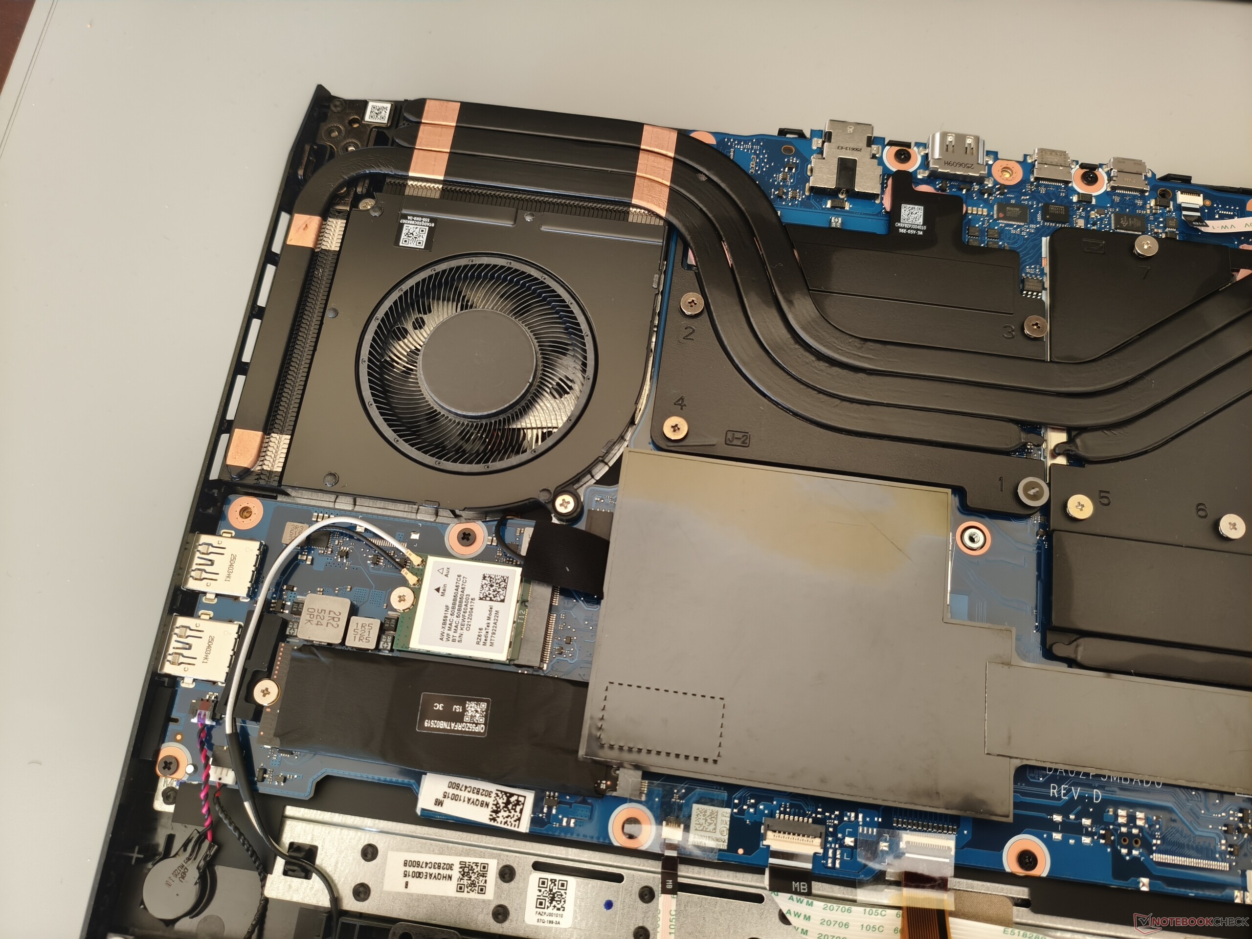 MediaTek'in kablosuz modülü (Wi-Fi 6E) özellikle çekim açısından iyi bir performans sergiliyor. Full HD çözünürlüğü sayesinde web kamerası diğer birçok oyun dizüstü bilgisayarından biraz daha keskin, ancak yine de gerçekten etkileyici değil. İç kısımlara erişmek için 10 adet Phillips vidanın çıkarılması gerekiyor. Resimlerimiz kaputun altında neye benzediğini ortaya koyuyor.