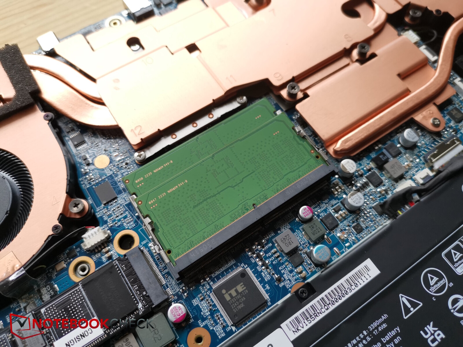 Dahili bileşenlere erişmek için aynı boyuttaki 14 Phillips vidayı çıkarmanız gerekir. Plastik taban plakası daha sonra kolayca kaldırılabilir. Altında bol miktarda bakır içeren bir soğutma sistemi, vidalı bir pil, iki RAM yuvası, iki ped ile soğutulan SSD ve değiştirilebilir WiFi modülü bulacaksınız.